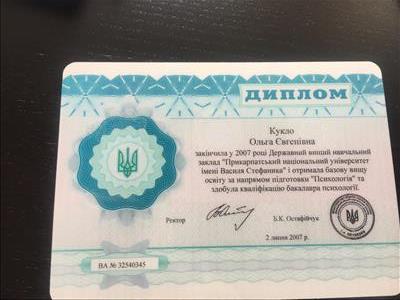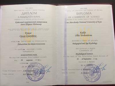 Кандидат психологічних наук. Захищалася у національному університеті імені Тараса Шевченка.