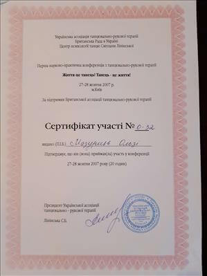 Брала участь у науково-практичній конференції Української асоціації танцювально-рухової терапії у 2007 році.
