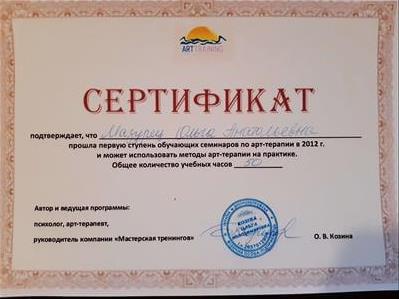Отримала сертифікат, що підтверджує, що пройшла цикл навчальний семінарів з арт-терапії на практиці та можу використовувати методи арт-терапії на практиці у 2013 році, авторитетних ведуча програми: психолог, арт-терапевт О.В. Кошик, Директор обласного ПМП центру Мушинський В.П.