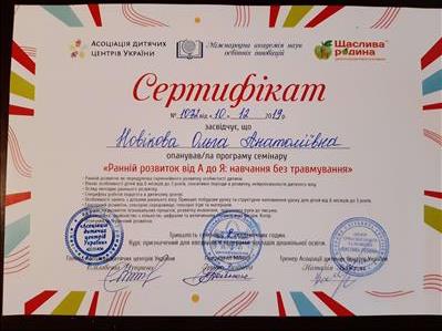 Пройшла програму семінару "Ранне розвиток від А до Я: навчання без травм", отримала підтверджуючий сертифікат від "Асоціації дитячих центрів України", "Міжнародна академія наук освітніх інновацій", "Центр сучасної освіти та розвитку "Щаслива родина"".