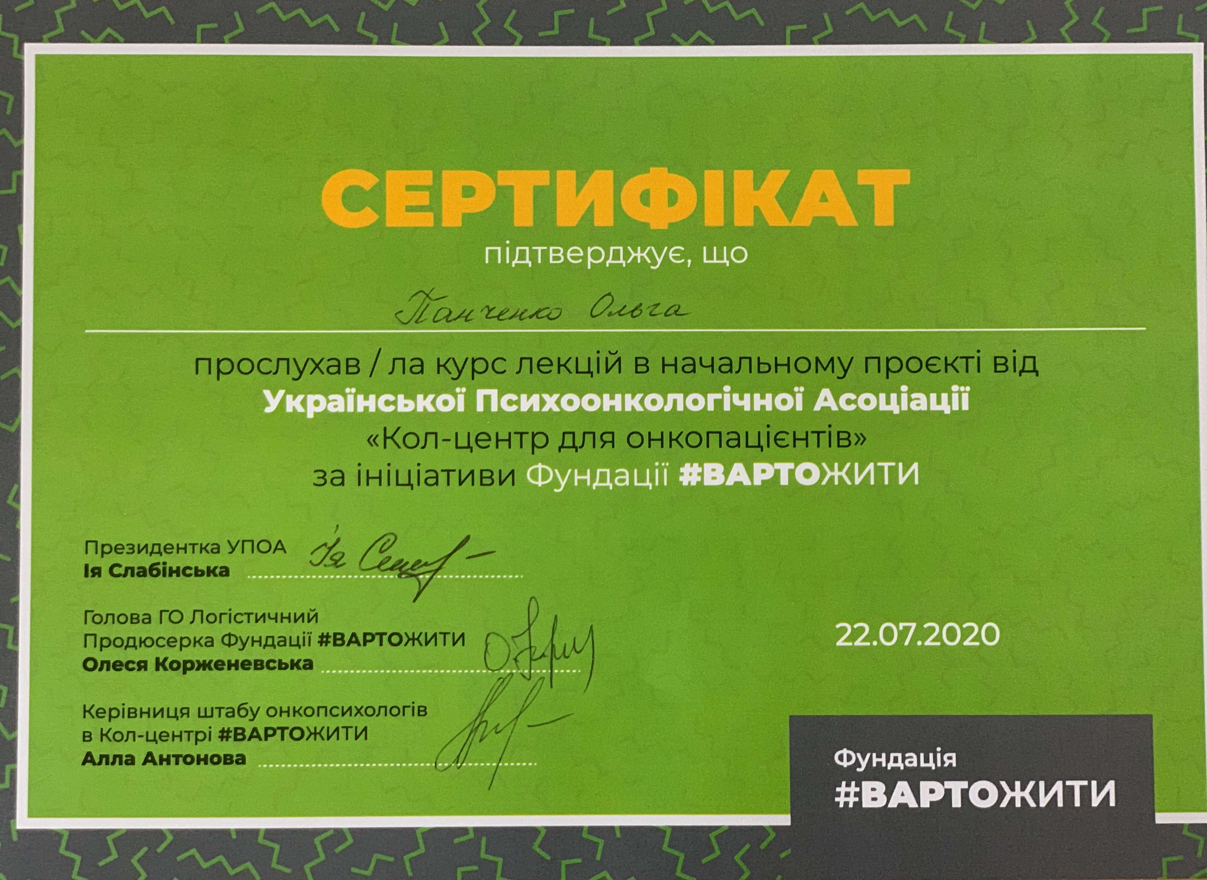 курс лекцій в начальному проєкті від Української Психоонкологічної Асоціації «Кол-центр для онкопацієнтів»