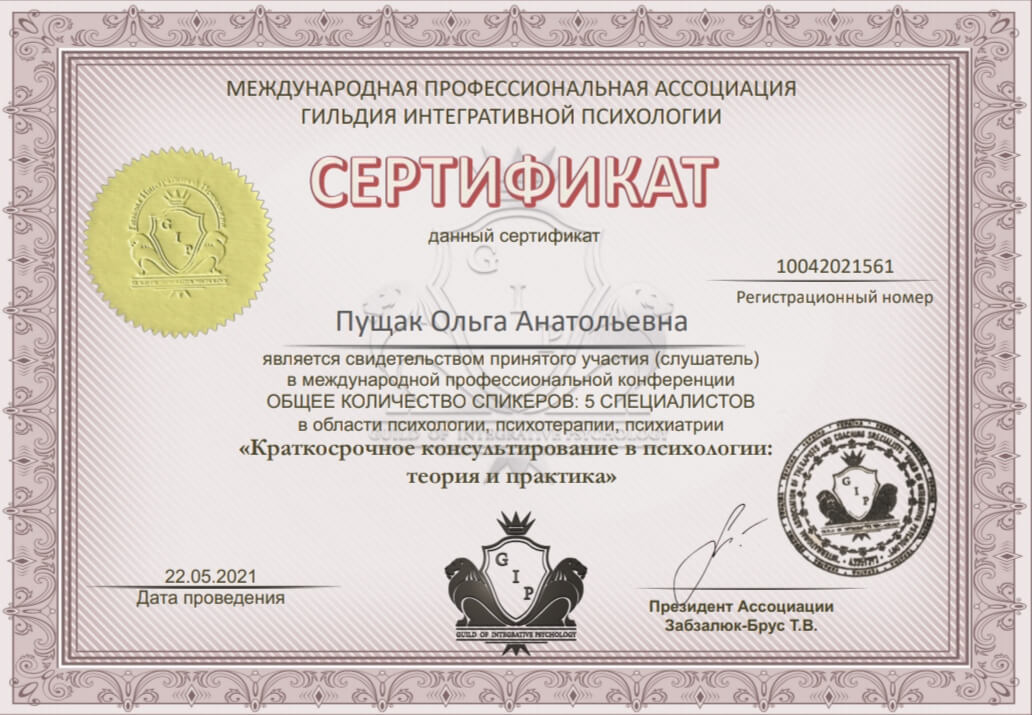 я практикуючий психолог-консультант. Працюю в методі позитивної психотерапії, а також тілесно-орієнтованої терапії в методі системної медіації глибинного лікування. Оскільки маю відношення до музичної сфери (за першою освітою), успішно застосовую арт-терапевтичні методики у своїй практиці. Знаходжуся в постійному розвитку та продовжую активно розширювати сферу своїх знань у психології, на курсах, авторських тренінгах та семінарах.