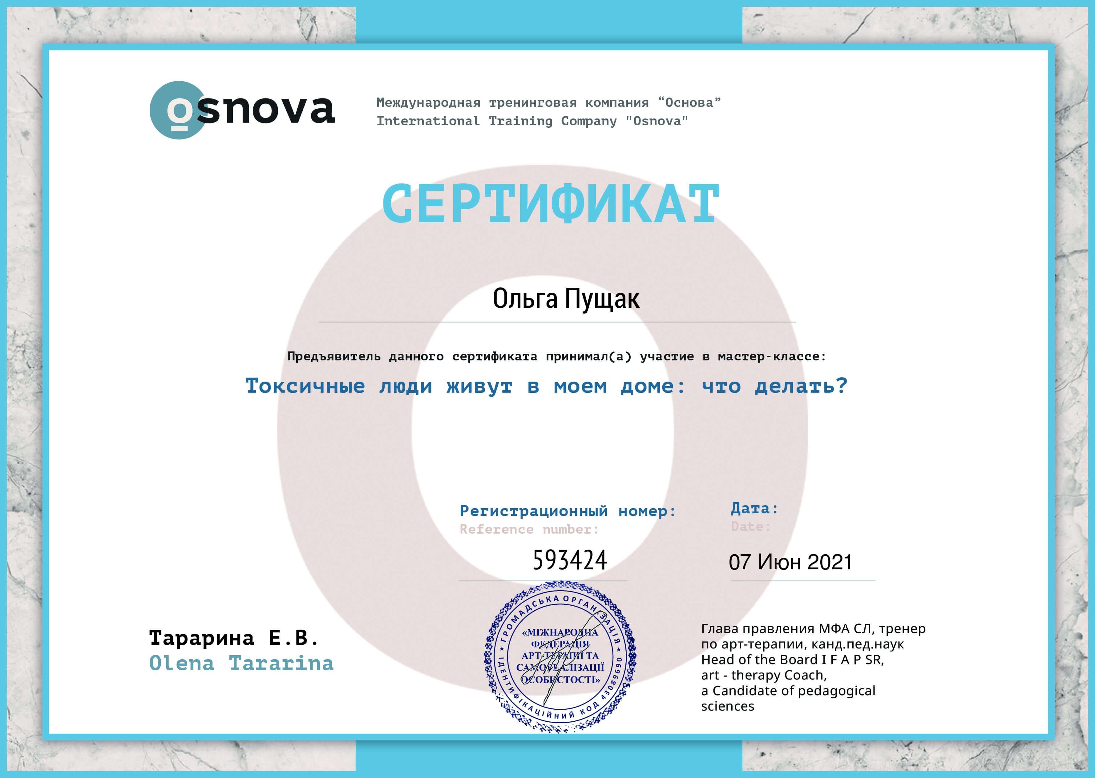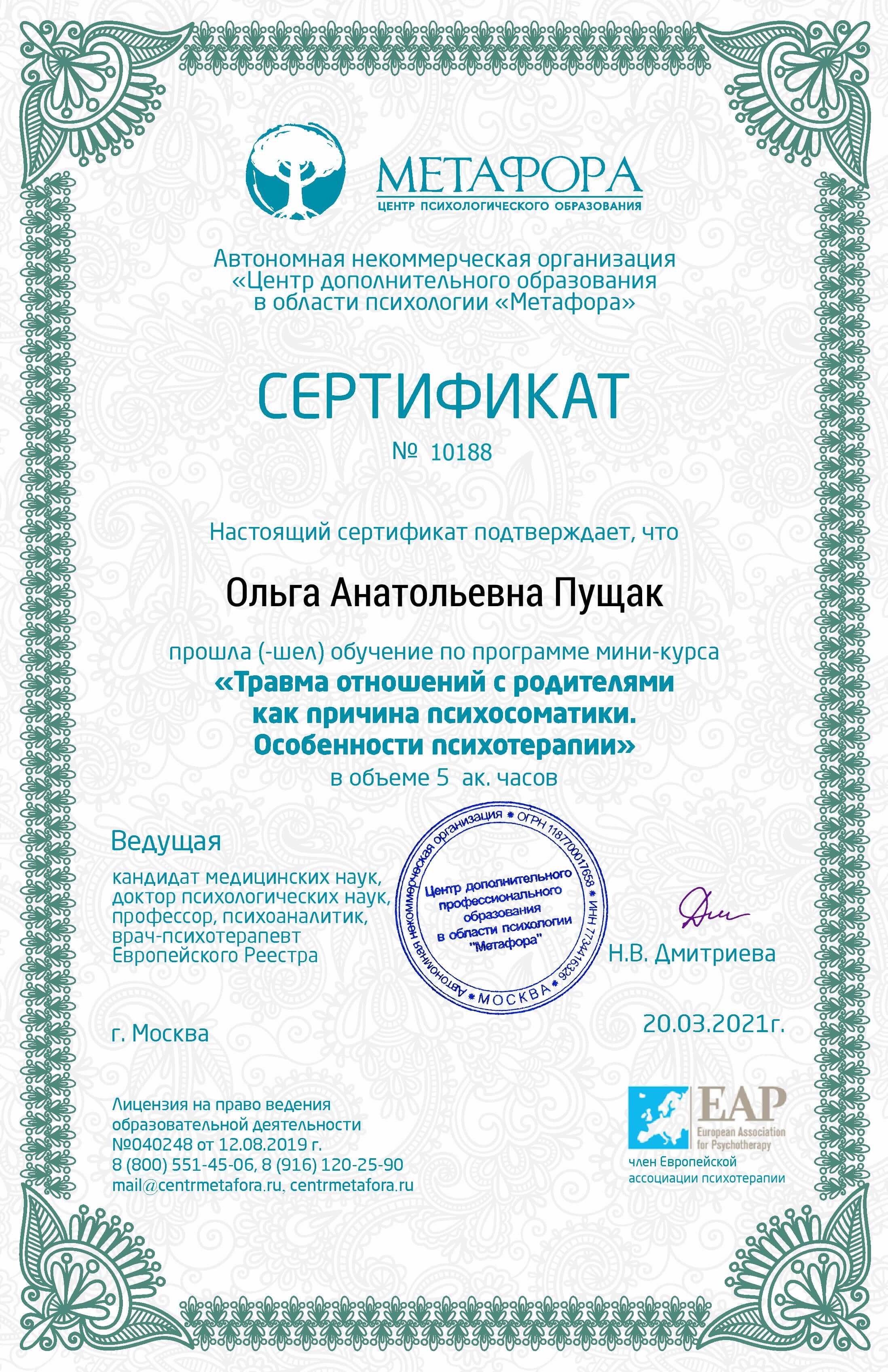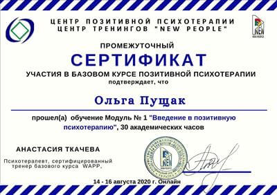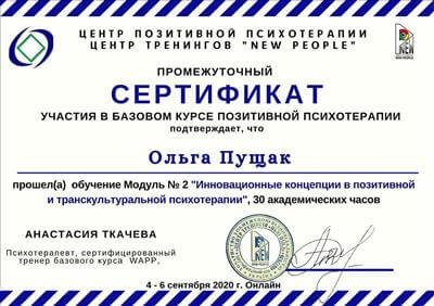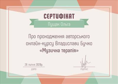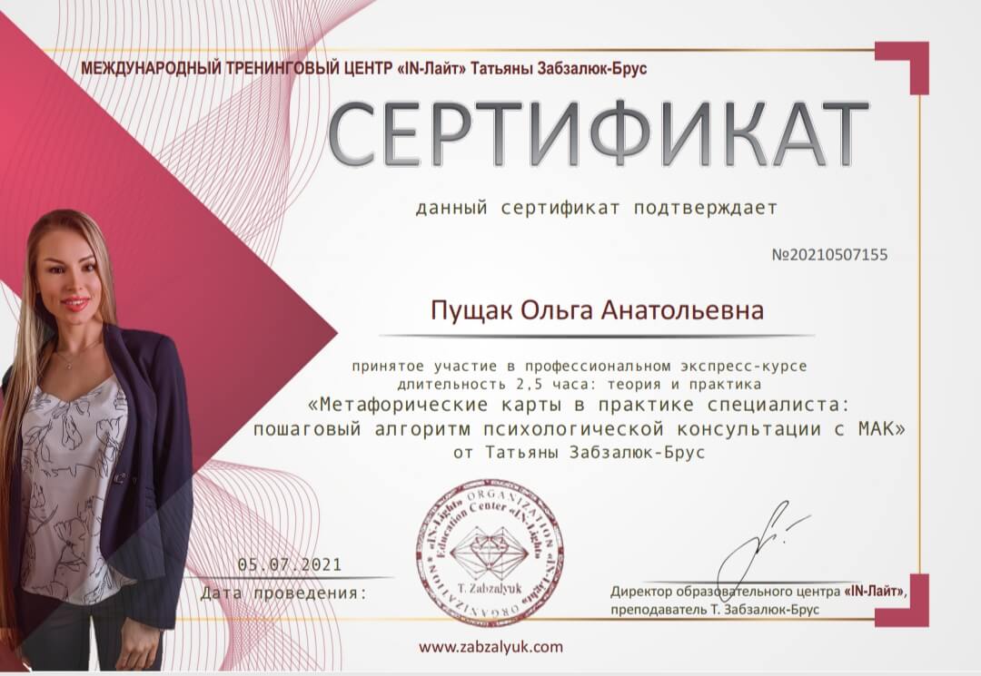 Сертифікований психолог-консультант у методі позитивної психотерапії. Пройшла курс музичної терапії та успішно застосовую метод у своїй практиці. Пройшла авторський курс НЛП Алуніки Добровольської "Money Woman". Пройшла авторський курс у тренера з особистісного зростання та розстановника Л.Іванової "Стати господарем свого життя", також семінар-тренінг розстановних практик "Арифметика відносин", "Колесо життя", тренінг "Моє кохання де воно". Пройшла авторський курс Л. Бережанської у центрі комплексної терапії Астрід "Архетипи особистості". Пройшла курс МАК-експерт у психологічному консультуванні від Міжнародної гільдії психологів та психотерапевтів. Пройшла курс психологічного центрування методом Системна медіація глибинного лікування.