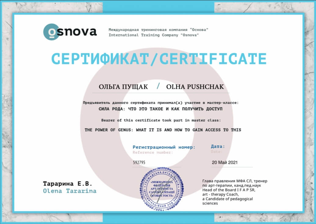 Завдяки методам, в яких працюю, я і мої клієнти постійно переконуємося в тому, що кожна людина має необхідний ресурс для подолання труднощів та вирішення будь-яких життєвих ситуацій, навіть якщо на перший погляд вони здаються непереборними.