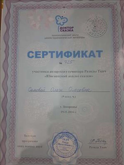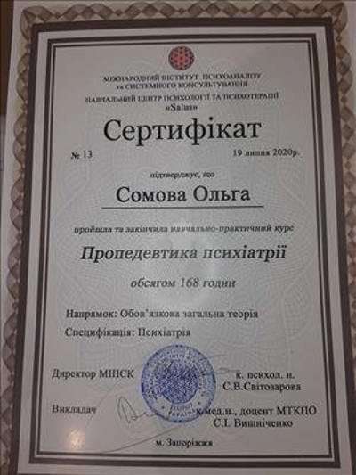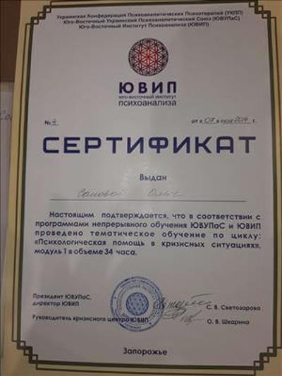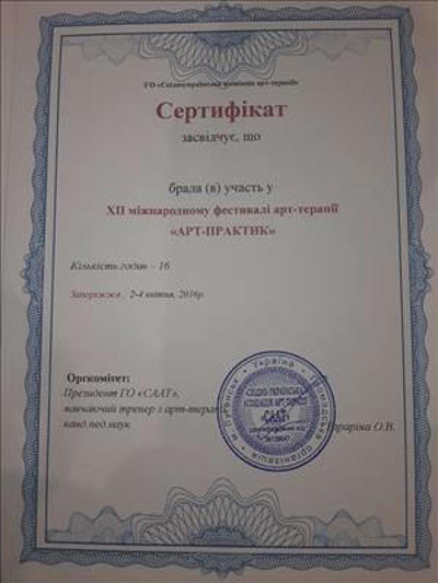 ЗІГМУ 1997-2003, Соціолог, соціальний працівник. ЮВІП 2012-2016 класичний та сучасний психоаналіз. Короткострокова подружня терапія 2016 р, Психологічна допомога в кризових ситуаціях 1014г, , АНО ДПО ВДАПРССС підвищення кваліфікації Нейропсихологія дитячого віку. , Учасник різних семінарів з арттерапії, Класичний приватний університет, магістр психології 2018, курс підвищення кваліфікації Пропідевтика психіатрії (обов'язкова загальна теорія для психологів) 2020р.