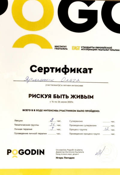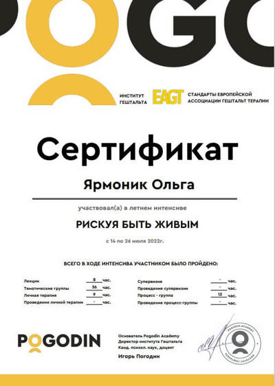 - Pogodin Academy 1 cтупінь гештальт-терапії;