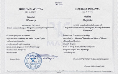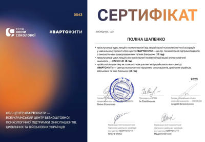 Продовжую постійно навчатися, беру участь в професійних конференціях, мастер-класах, інтенсивах. Наразі здобуваю кваліфікацію супервізора, тренера для психотерапевтів.