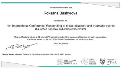 03.09.2022 - 05.09.2022 - Конференція "Відповідаючи кризі, катастрофам та травматичним подіям", Complex Trauma Institute, UK