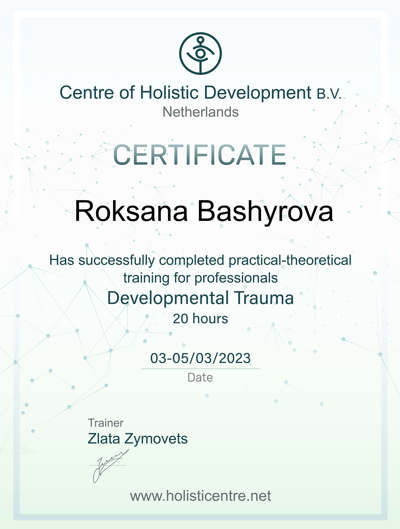 10.2023 - досі: курс з Травматерапії від Центра Холістичного Розвитку, Нідерданди