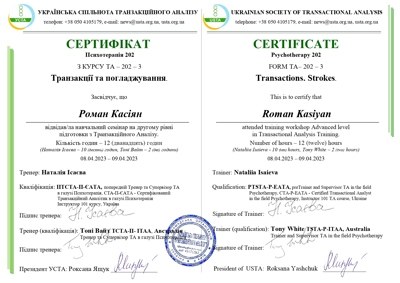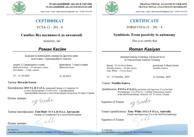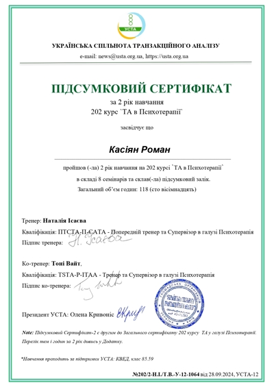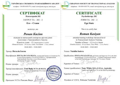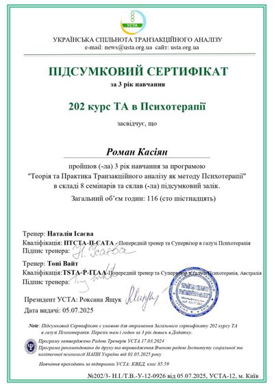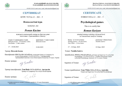 Проходжу останній рік навчання на психотерапевта у методі Транзакційний аналіз.