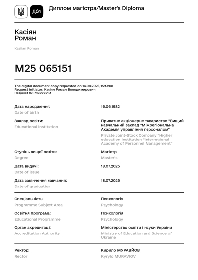 Здобув звання Магістр пихології у МАУП.