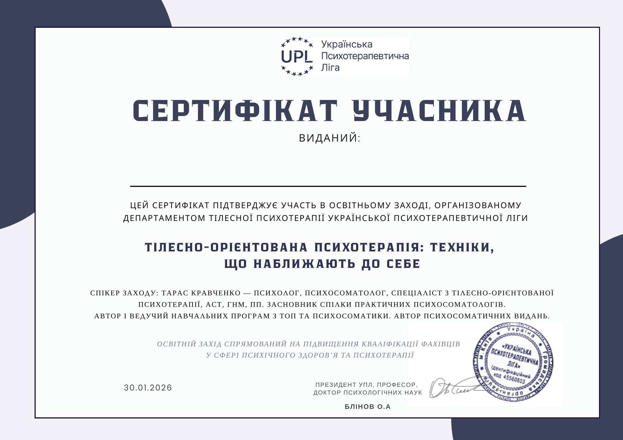 Маю також педагогічну освіту. Являюся дійсним членом Української психотерапевтичної ліги. Наразі підвищую кваліфікацію в Європейській школі психології. Проходжу регулярну особисту терапію, маю супервізію та інтервізію. Займаюся приватною практикою з 2019 року.