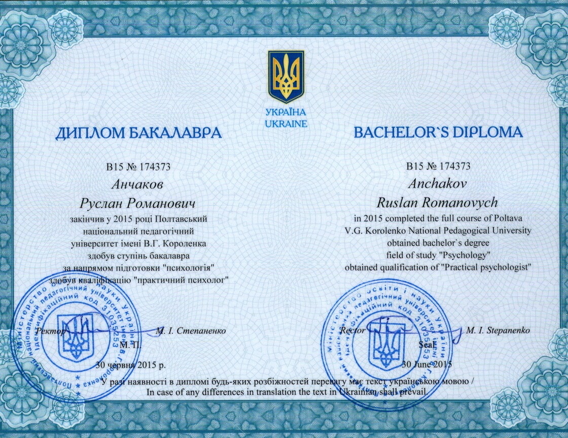 - Полтавський Національний Педагогічний Університет ім.В.Г. Короленка. Спеціальність "Психологія";