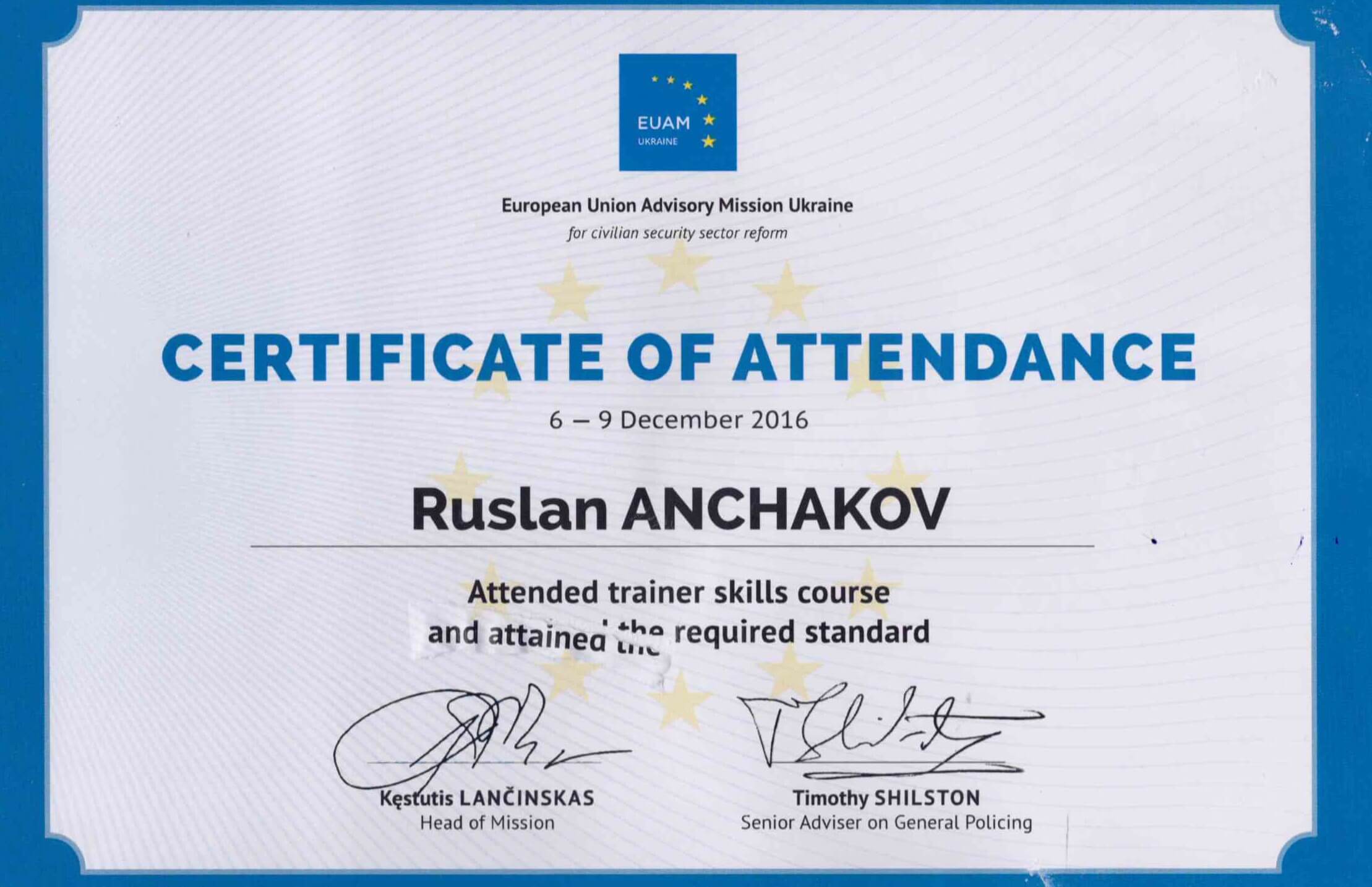 - EU Advisory Mission in Ukraine. Сертифікат Тренера;