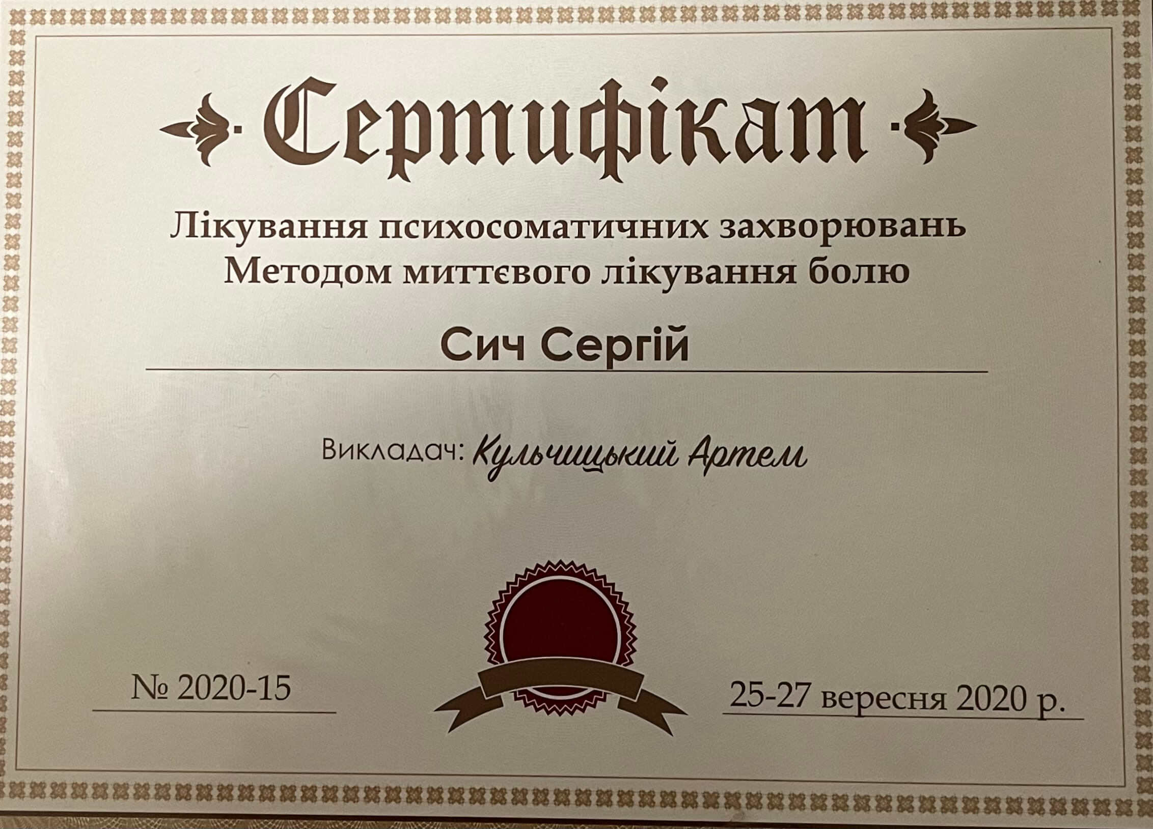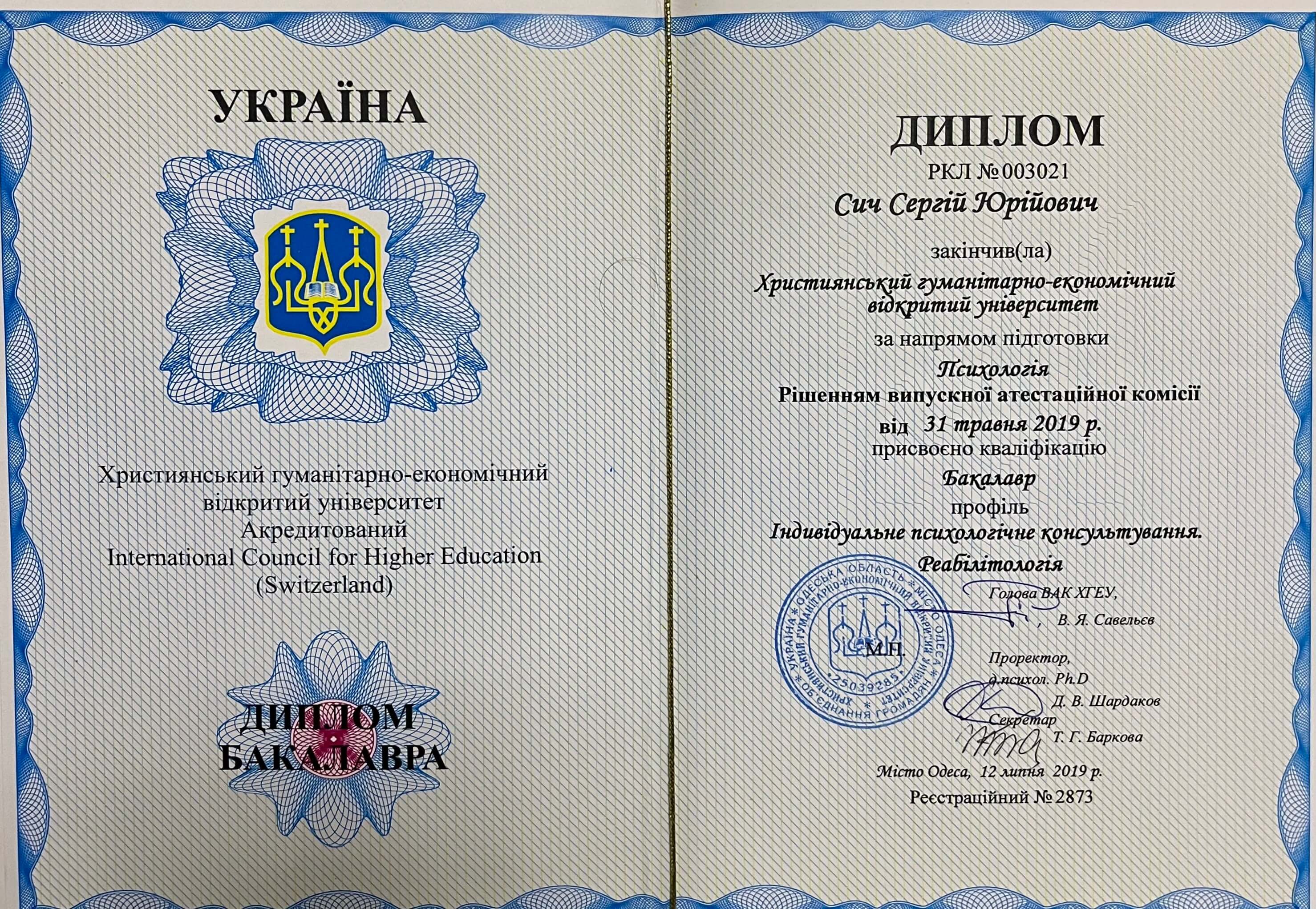 ХДЕУ факультет психології, реабілітолог, базовий курс позитивної психотерапії, зараз отримую освіту психотерапевта у методі позитивної психотерапії, метод миттєвого лікування болю, опрацювання психосоматики за методом Макулова, опрацювання первинного болю.