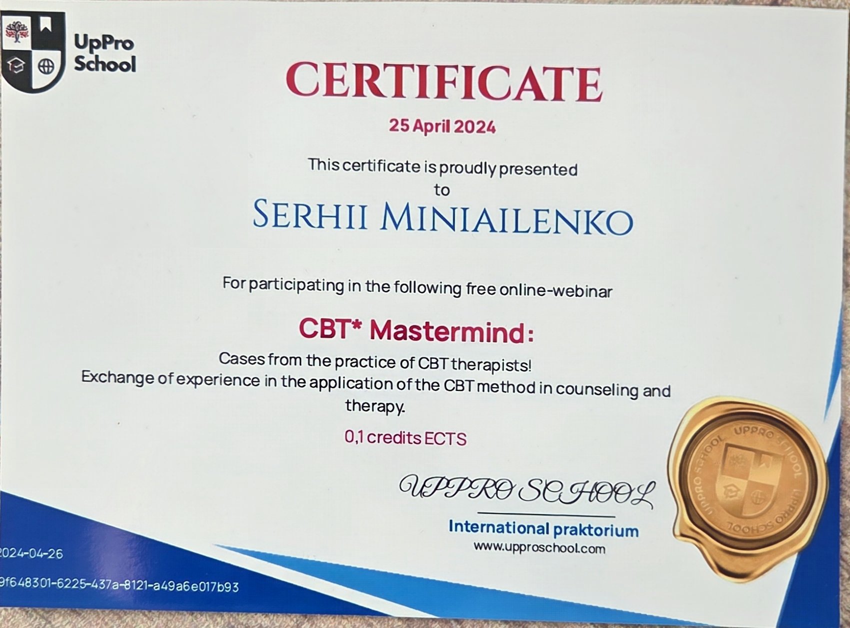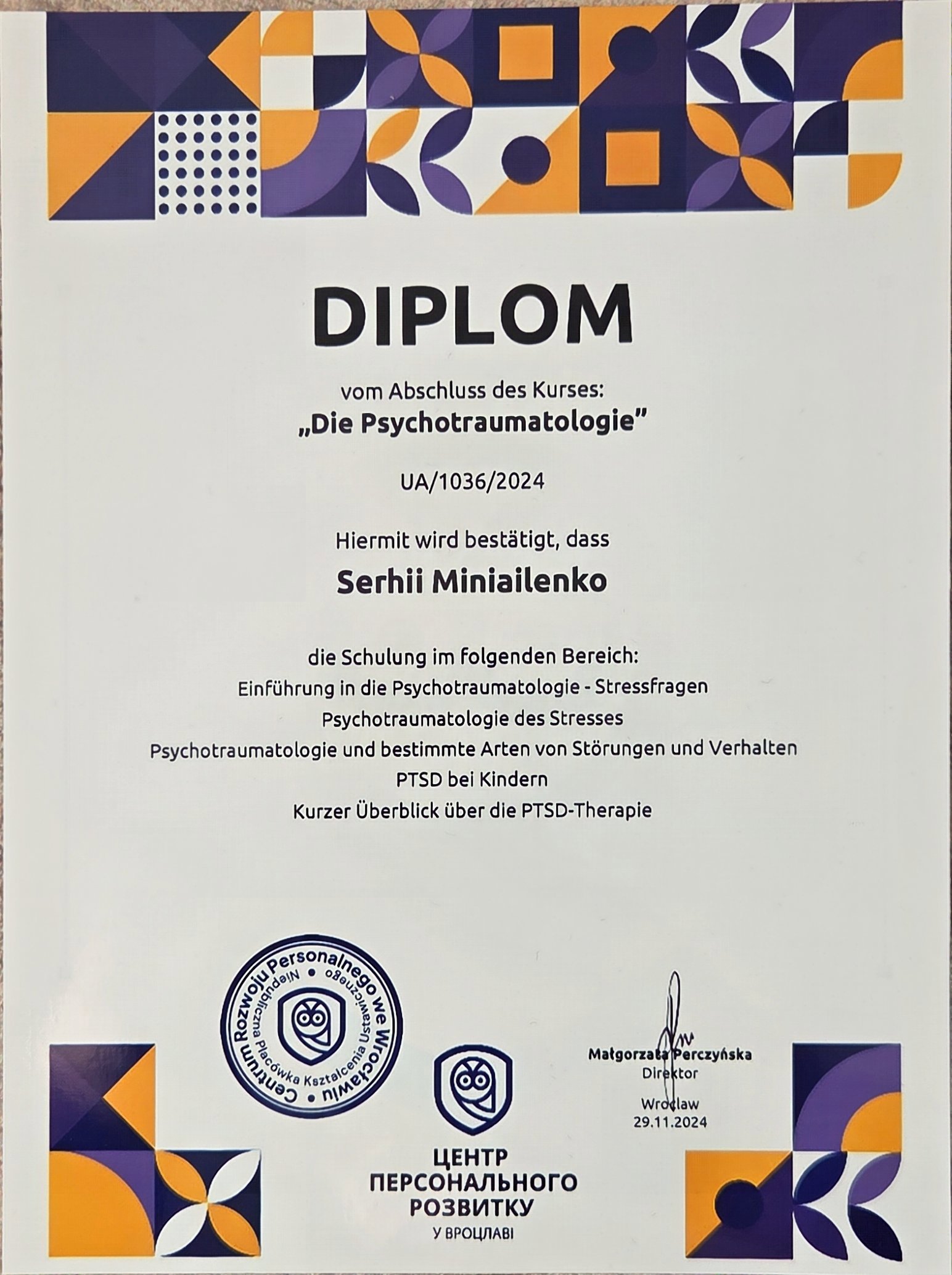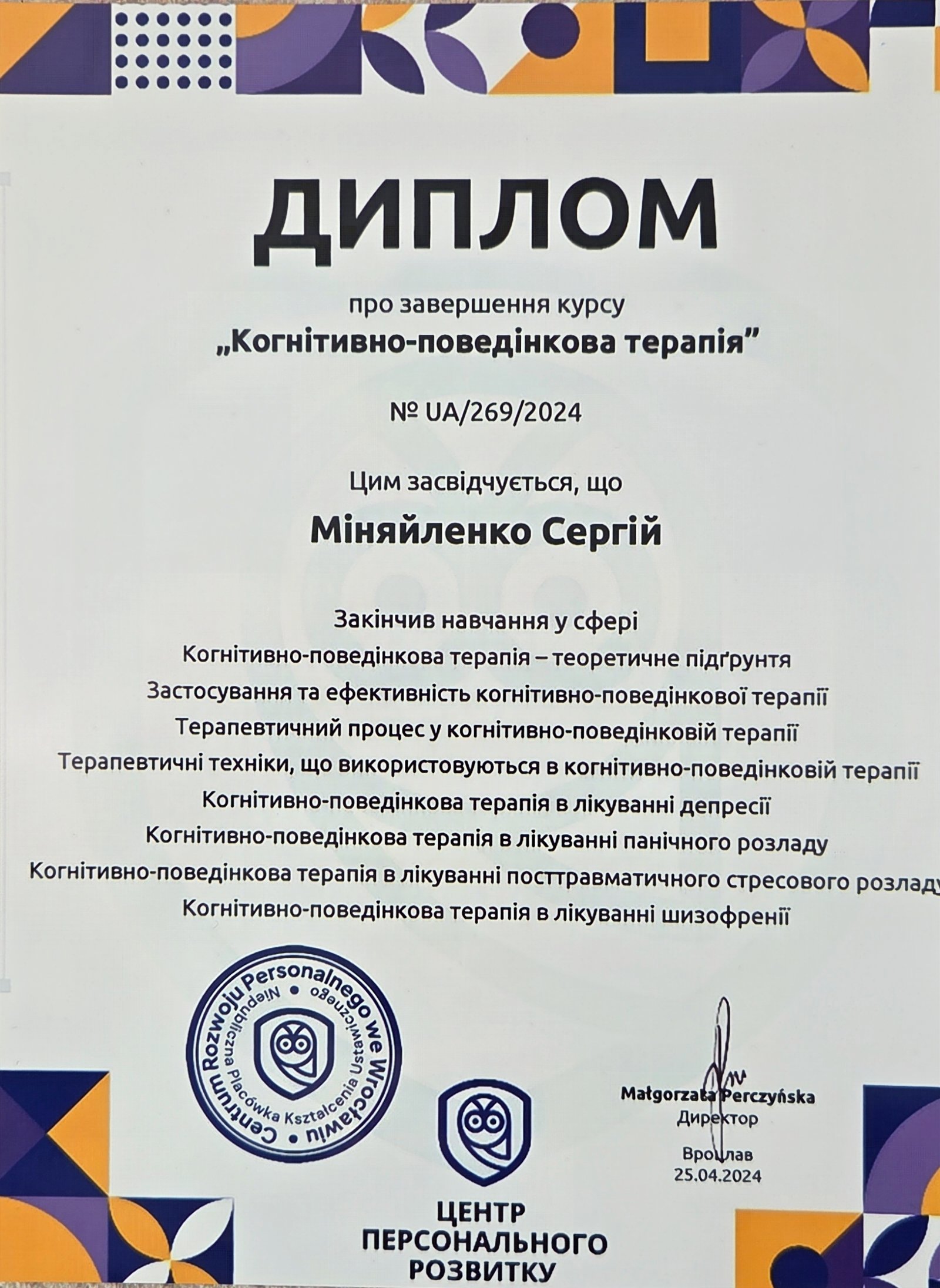 Я постійно підвищую свою професійну кваліфікацію та регулярно проходжу додаткове навчання. Наразі продовжую навчання на курсах з когнітивно-поведінкової терапії (КПТ) різних напрямків, а також поглиблюю знання у підході гештальт-терапії.