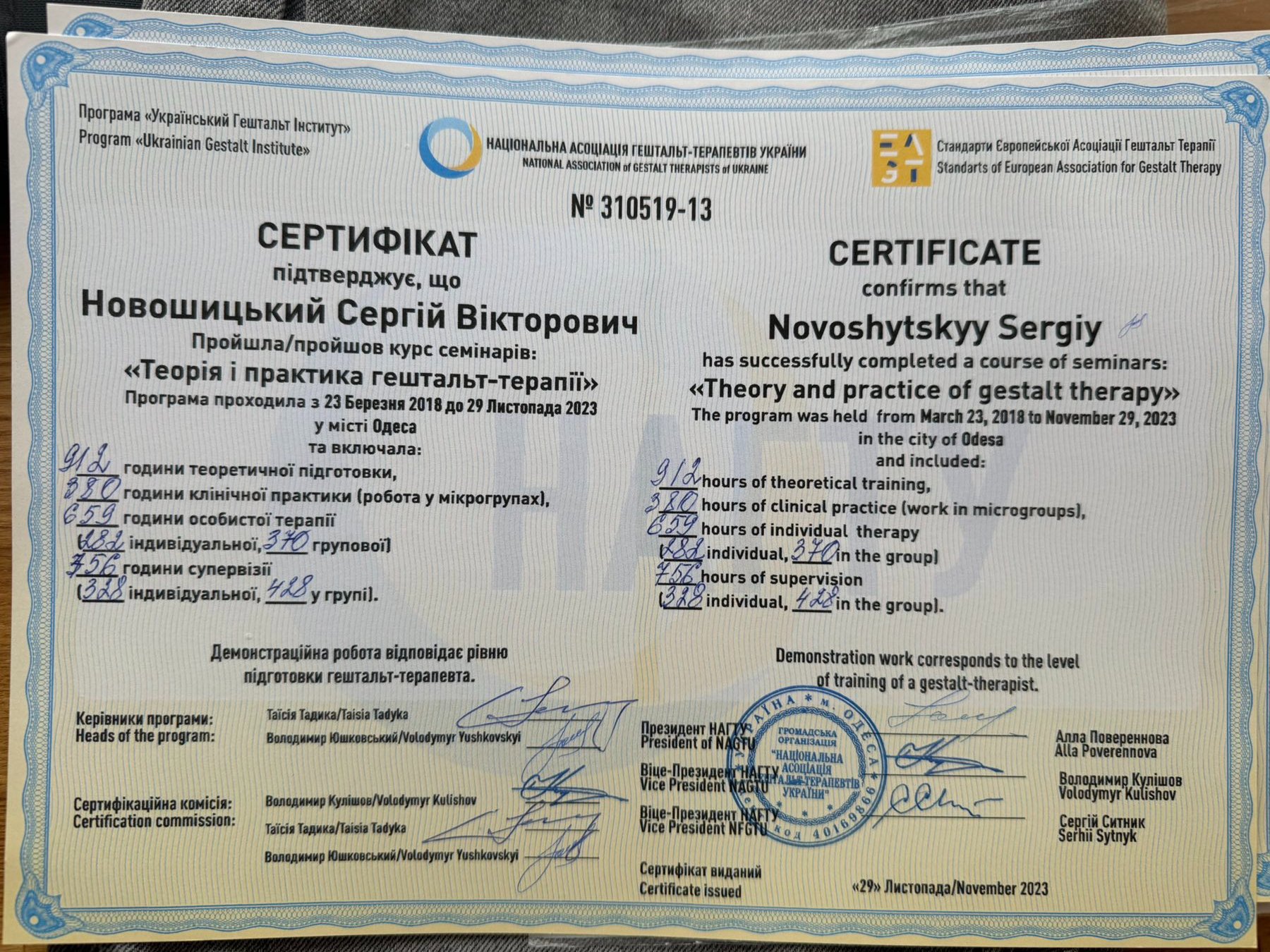 Національний універсітет ім.Мечникова, магістр психології, міжнародна спільнота гештальт терапевтів - аккредитований терапевт, супервізор.