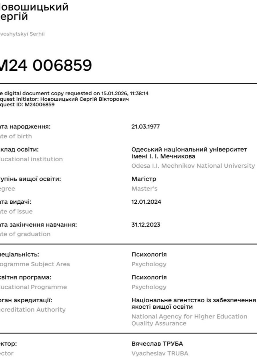 Добре працює із запитами дитячо-батьківські стосунки, тривога, неврози, сімейні конфлікти (нерозуміння, розставання, зради), незадовільні стосунки з рідними та близькими людьми. Сергій, як людина, уважний, вдумливий, відповідальний та надійний. Як психолог – професійний та талановитий. Психологія – його покликання .