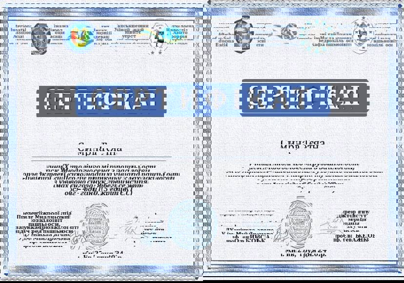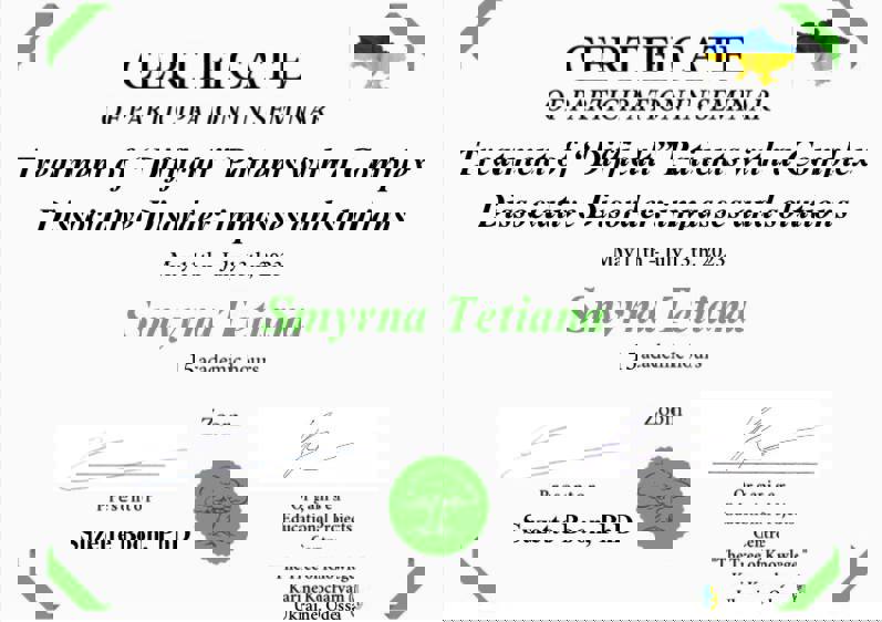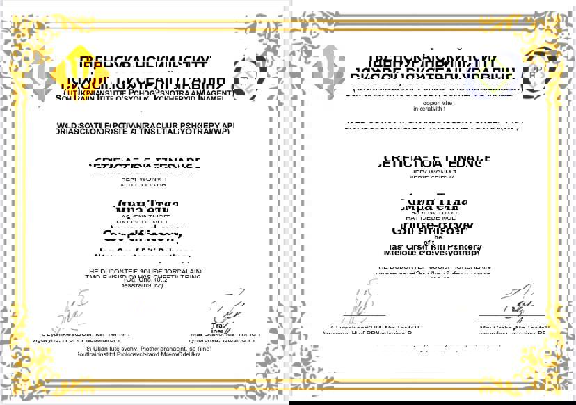 Закінчила: Одеський Національний Університет, Базовий курс консультування у методі Позитивної психотерапії за Пезешкіаном, консультування за допомогою Мак-карт та арт-терапії.