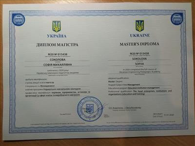Проходжу навчання в аспірантурі. Здобула академічну освіту рівня "магістр" за спеціальністю "практична психологія" в УІПА, м. Харків.