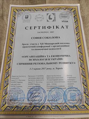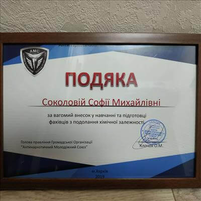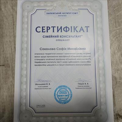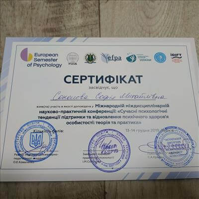 Проходжу сертифікацію на другому ступені МіГіП (гештальт – терапія). Навчено роботі з ПТСР на базі Харківського військового шпиталю. Сертифікована як системно – сімейний терапевт. Сертифікована як клінічний психолог.