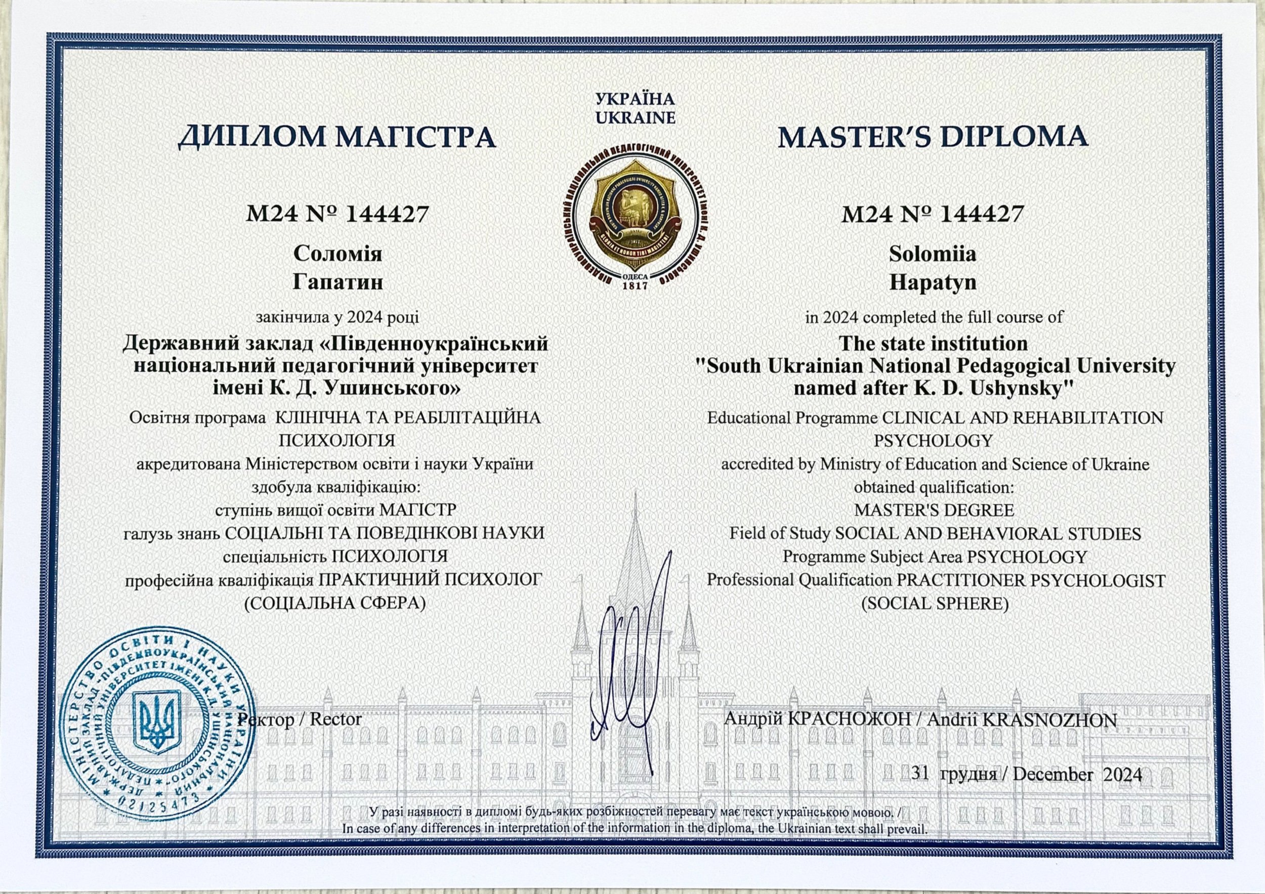 Пройшла спеціалізацію "клінічна психологія" та підтвердила професійну кваліфікацію у сфері охорони здоров'я в Академії Добробут.