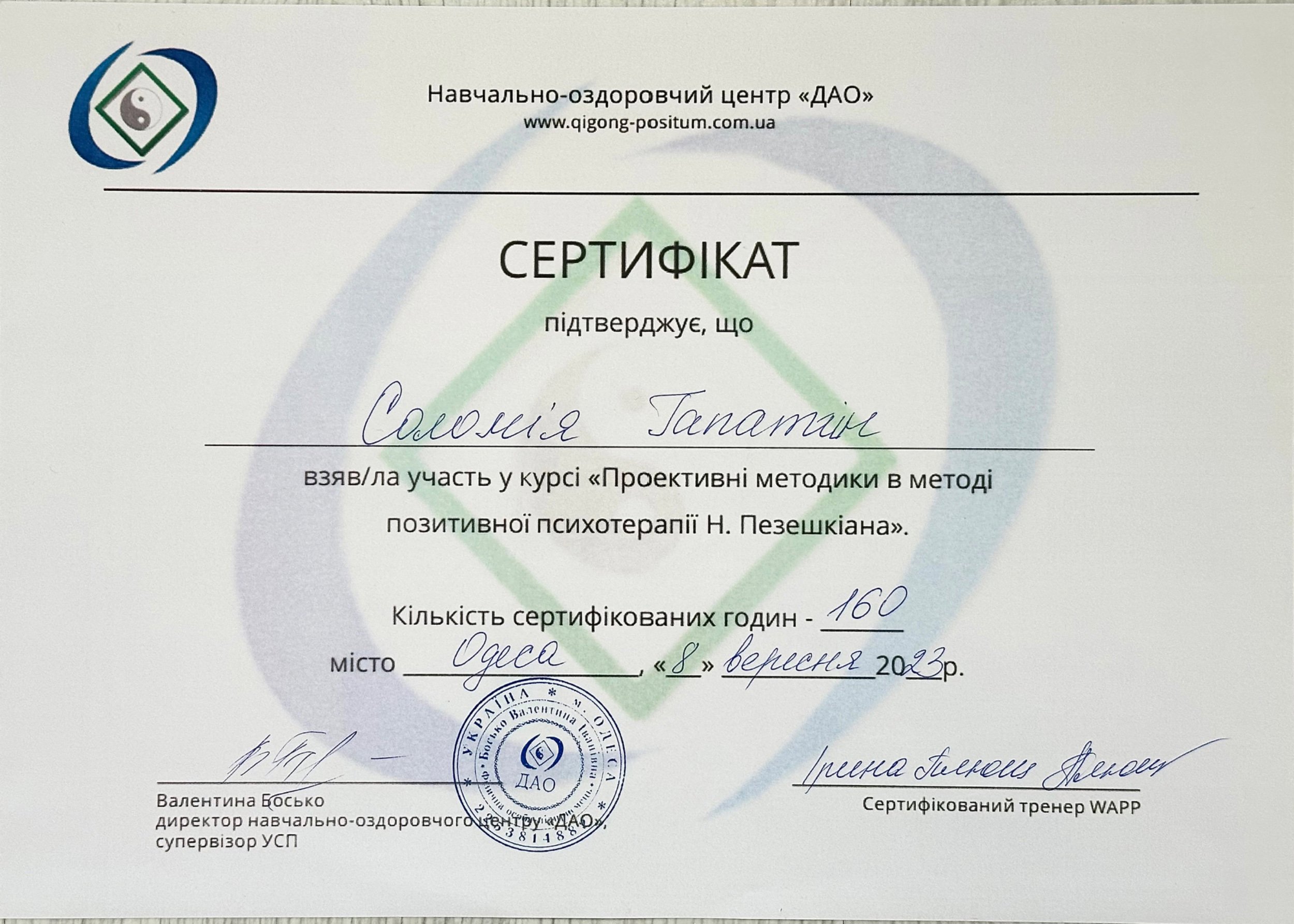 Пройшла курс "Проективні методики в методі позитивної психотерапії Н. Пезешкіана".
