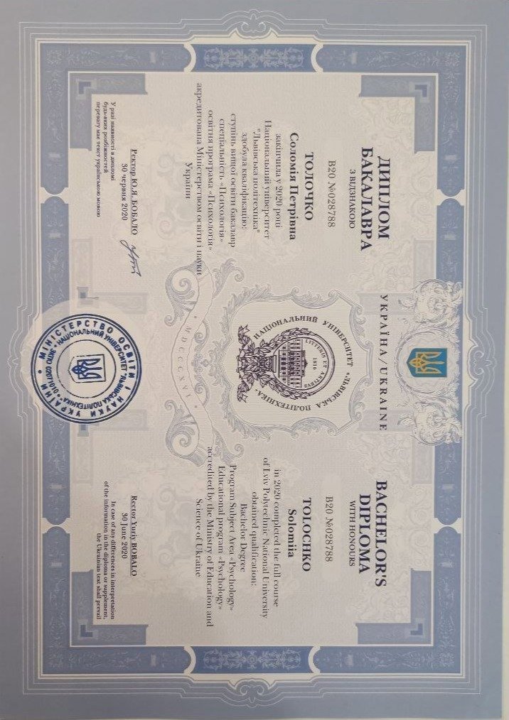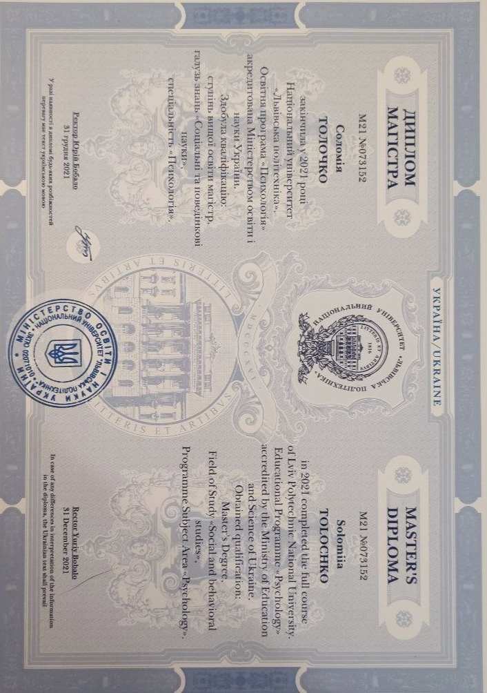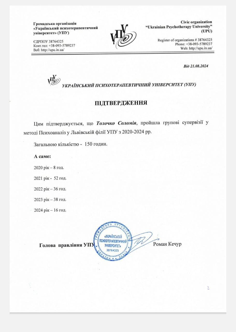 - з 2020 – студентка Українського Психотерапевтичного Університету. Метод: Психоаналіз