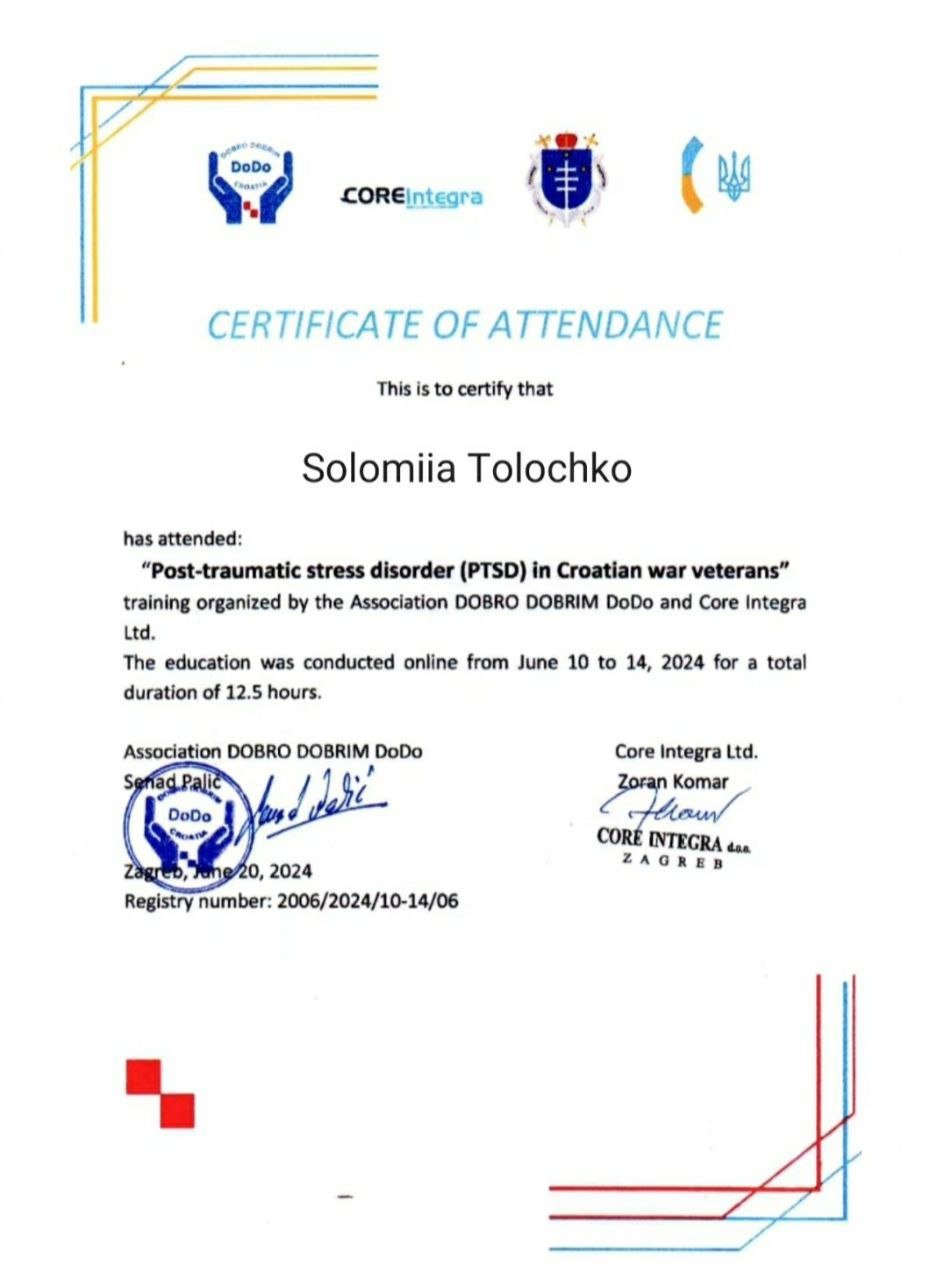 - Семінар "Посттравматичний стресовий розлад. Досвід хорватських ветеранів" (12 год)