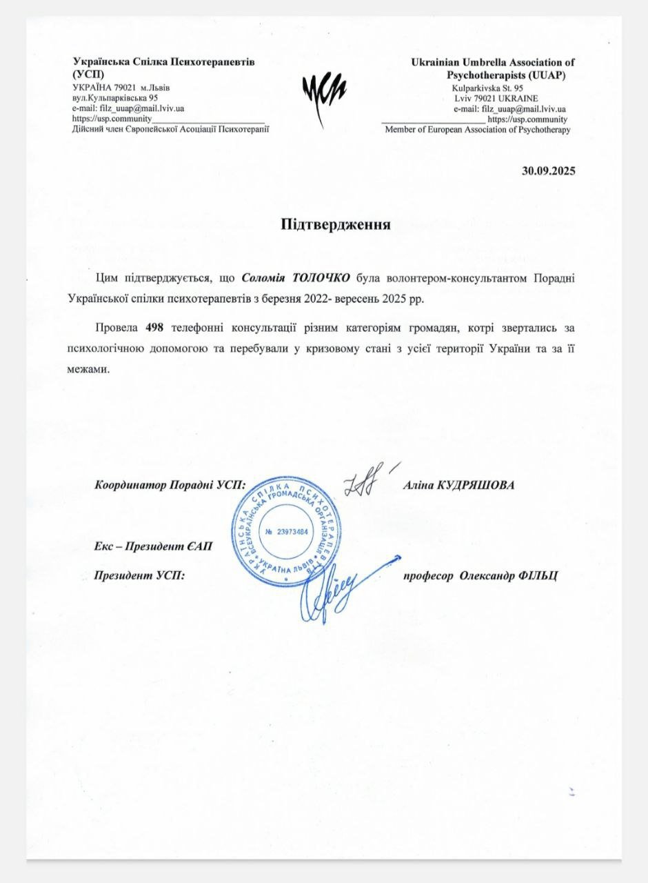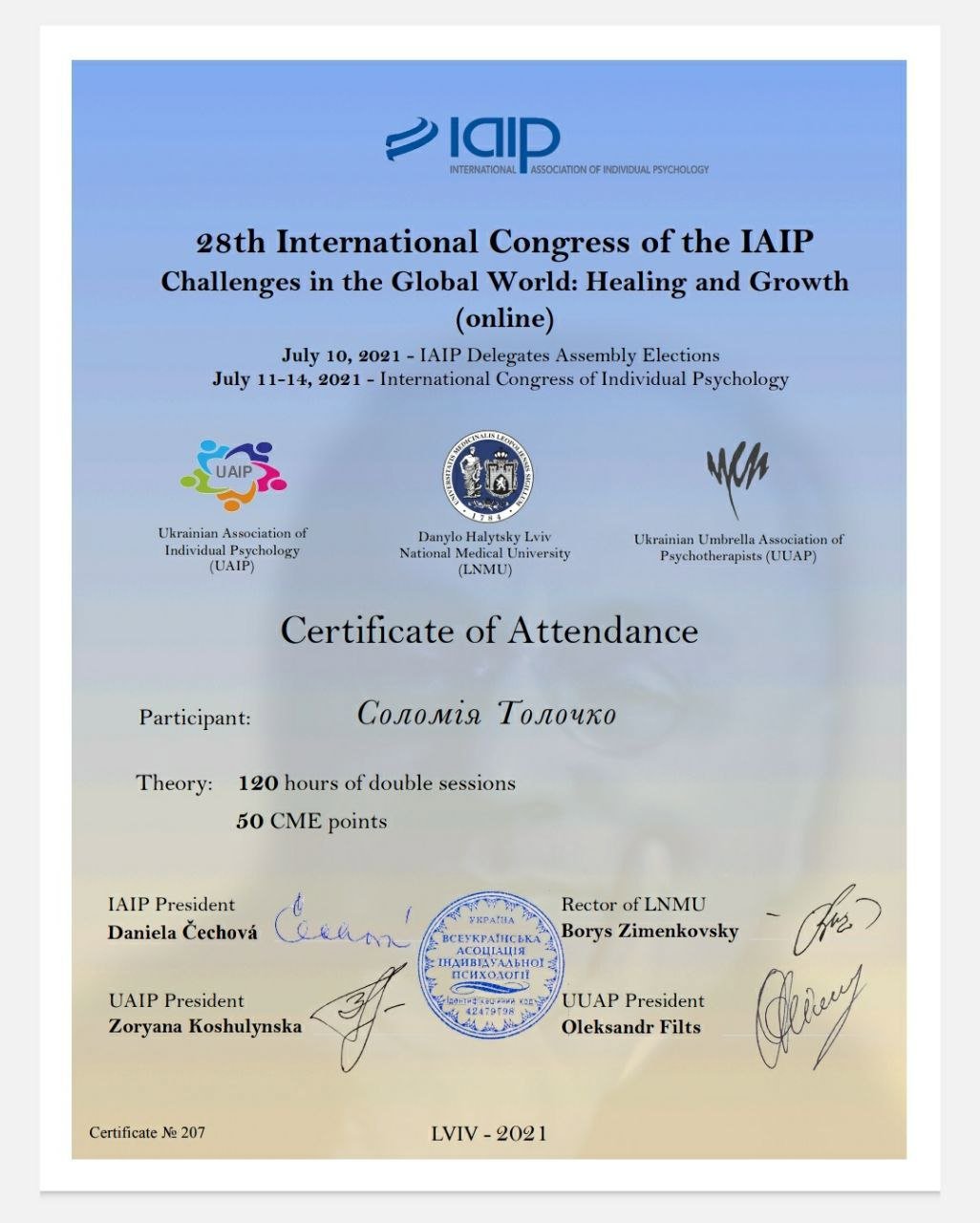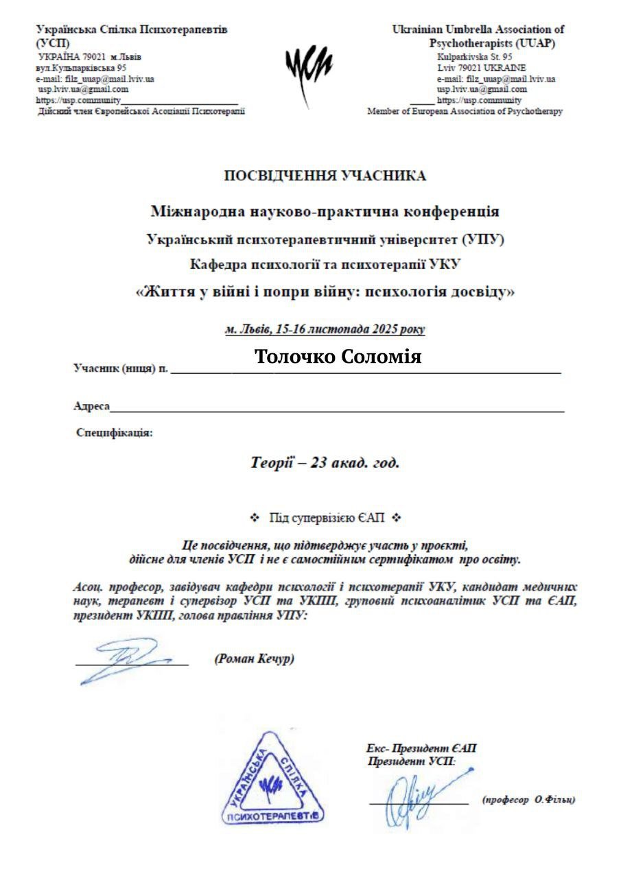 Danylo Halytsky Lviv National Medical University (LNMU), Ukrainian Association of Individual Psychology (UAIP), Ukrainian Umbrella Association of Psychotherapists (UUAP)