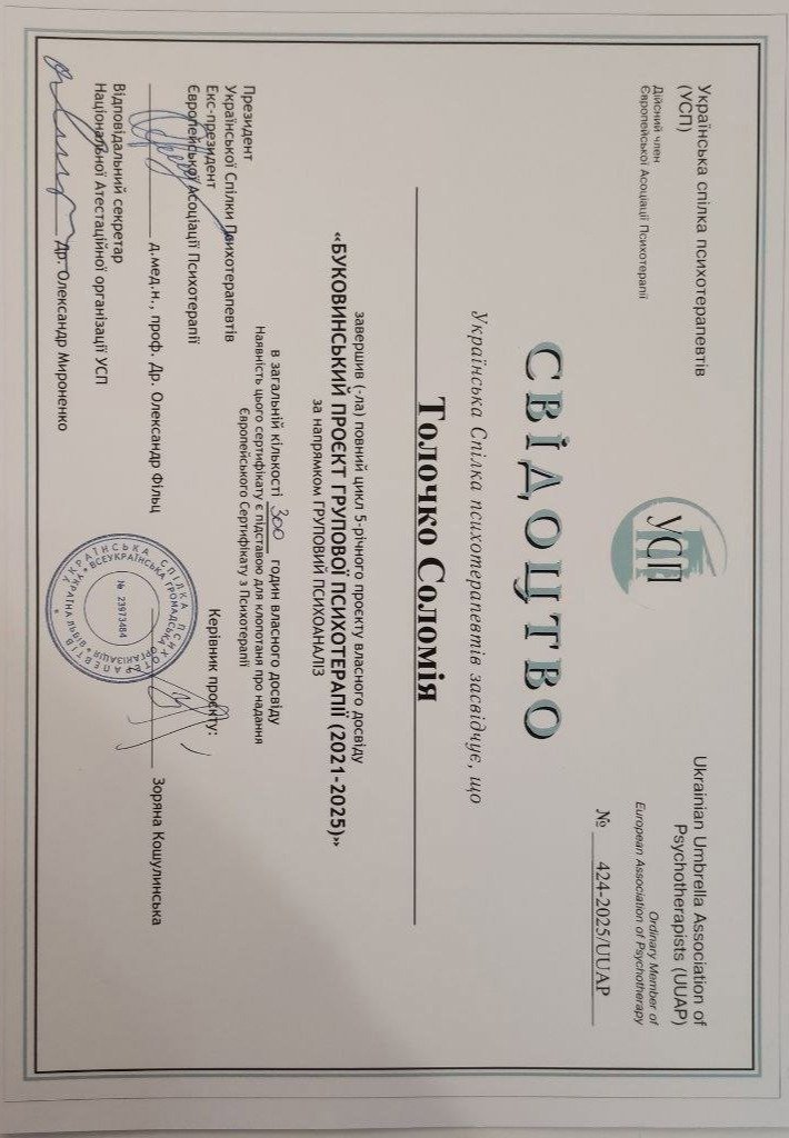 - з 2020 – 2025 – учасниця Буковинського проєкту групової психотерапії