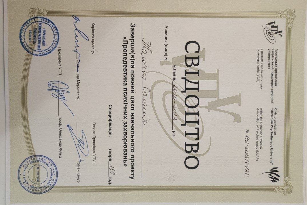 - Завершила повний цикл навчального проекту "Пропедевтика психічних захворювань" (150 год);