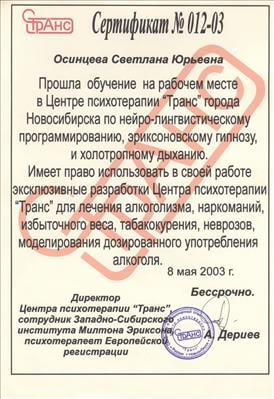 обучение на рабочем месте в Центре психотерапии "Транс" города Новосибирска по нейро-лингвистическому программированию, эриксоновскому гипнозу, и холотропному дыханию