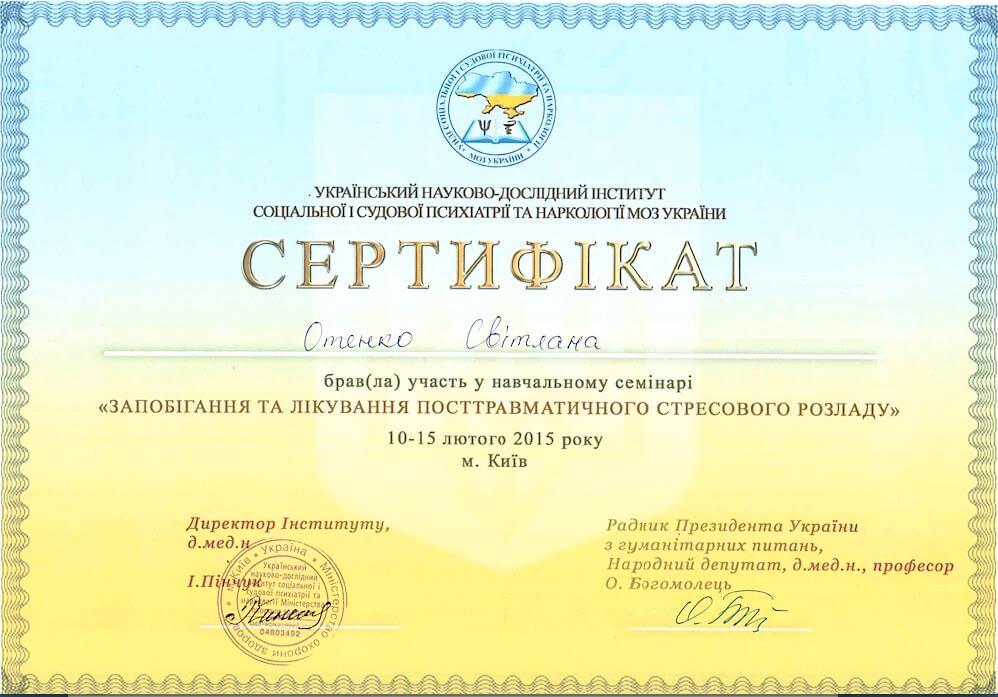2011 р. – Міжнародний семінар-тренінг «Позитивна психотерапія у роботі з дітьми та підлітками». Навид Пезешкіан, Київ, Україна.