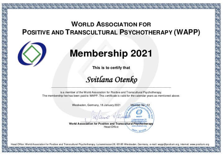 Всесвітня Асоціація Позитивних психотерапевтів (WAPP), Міжнародна Асоціація Позитивних психотерапевтів (IAPP), Європейська Федерація центрів Позитивної психотерапії (EFCPP), Вісбаденська Академія психотерапевтів (WAP). Спеціальність: психотерапевт, тренер 2003 – 2015 рр.