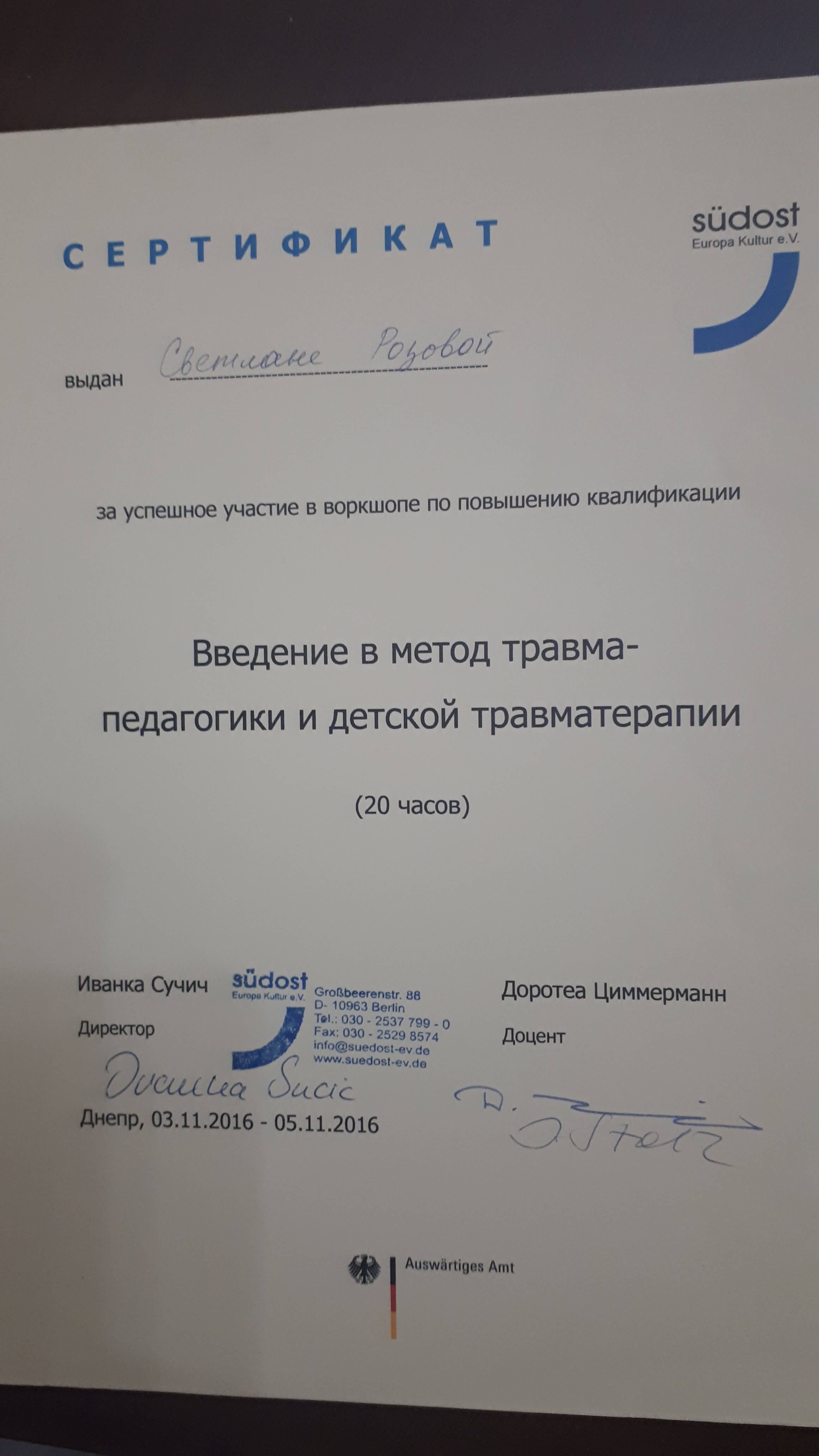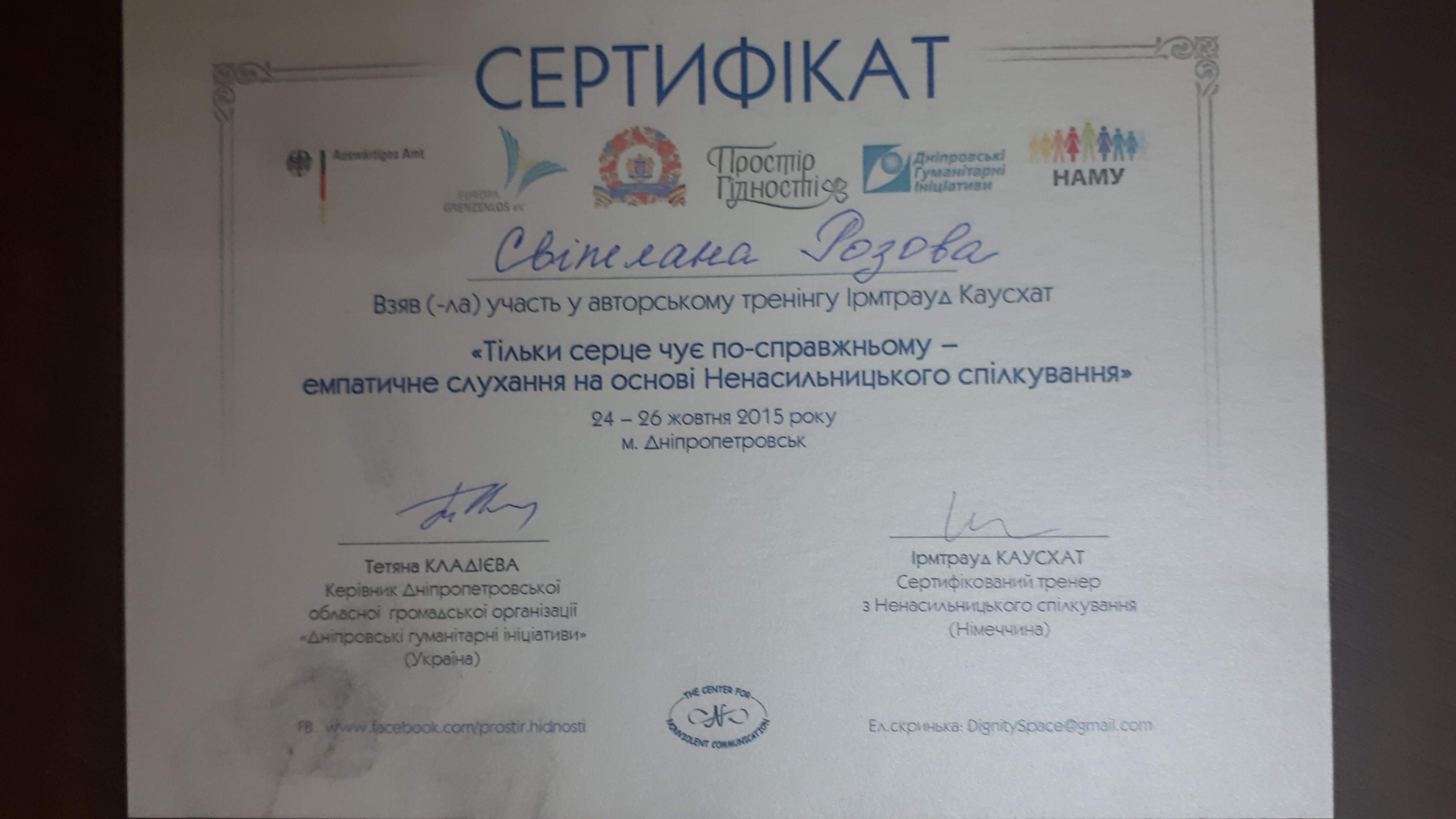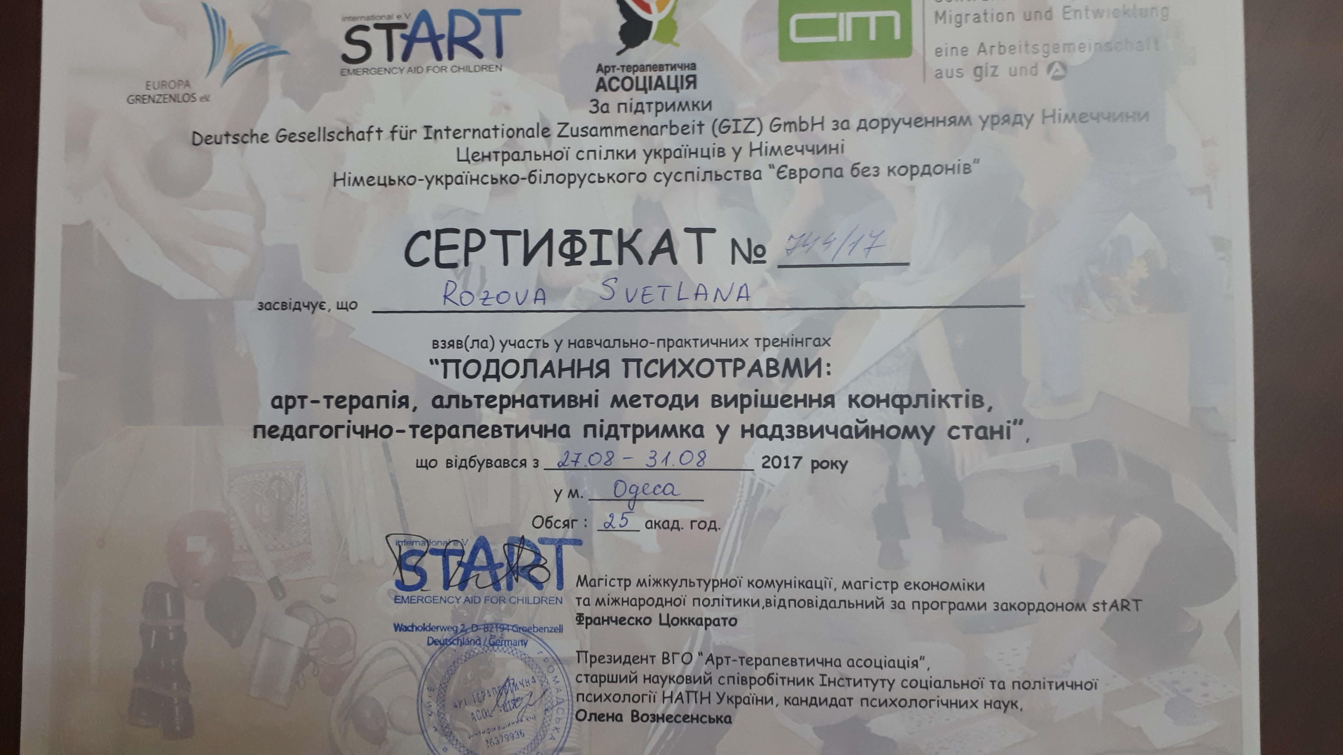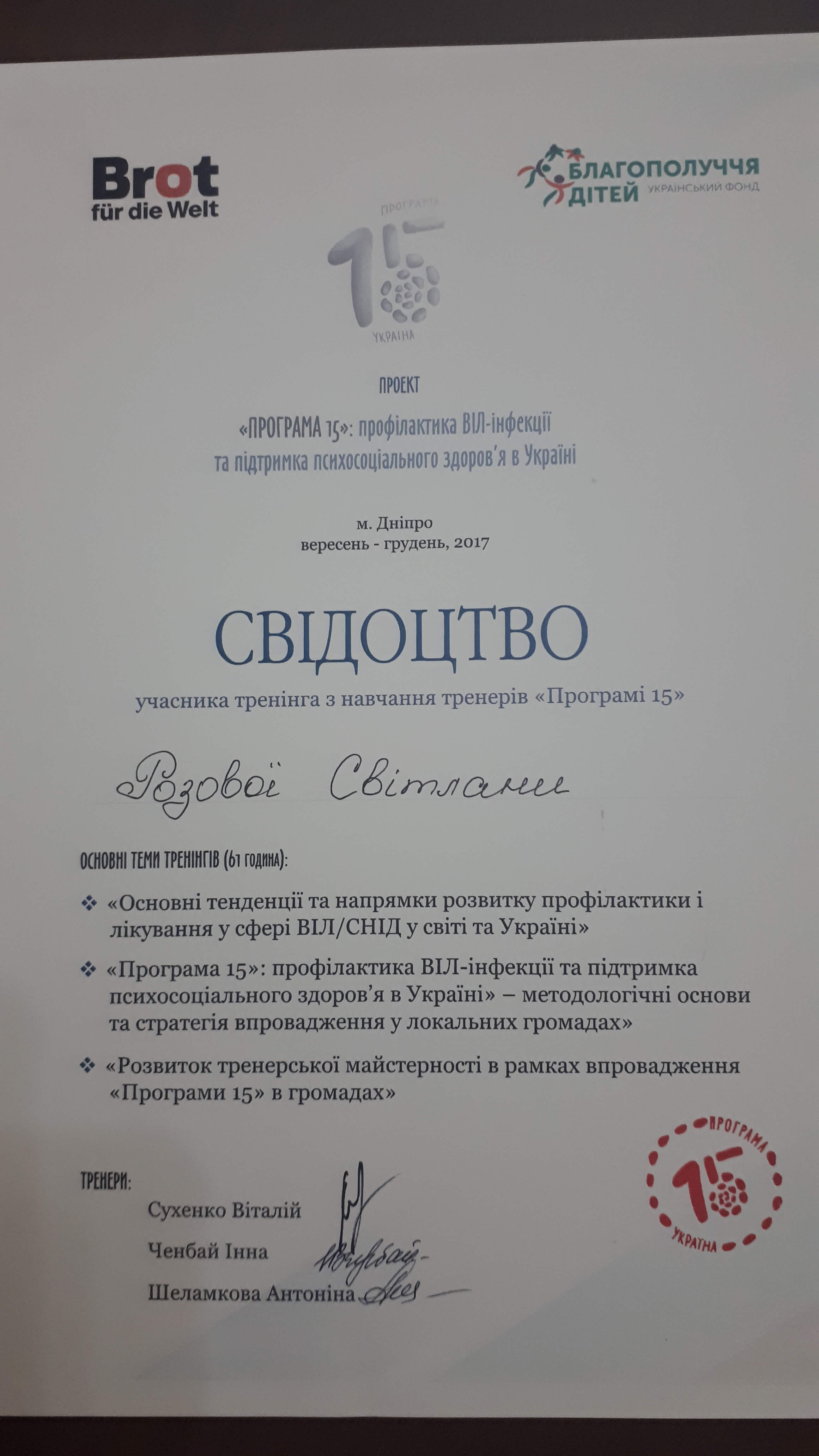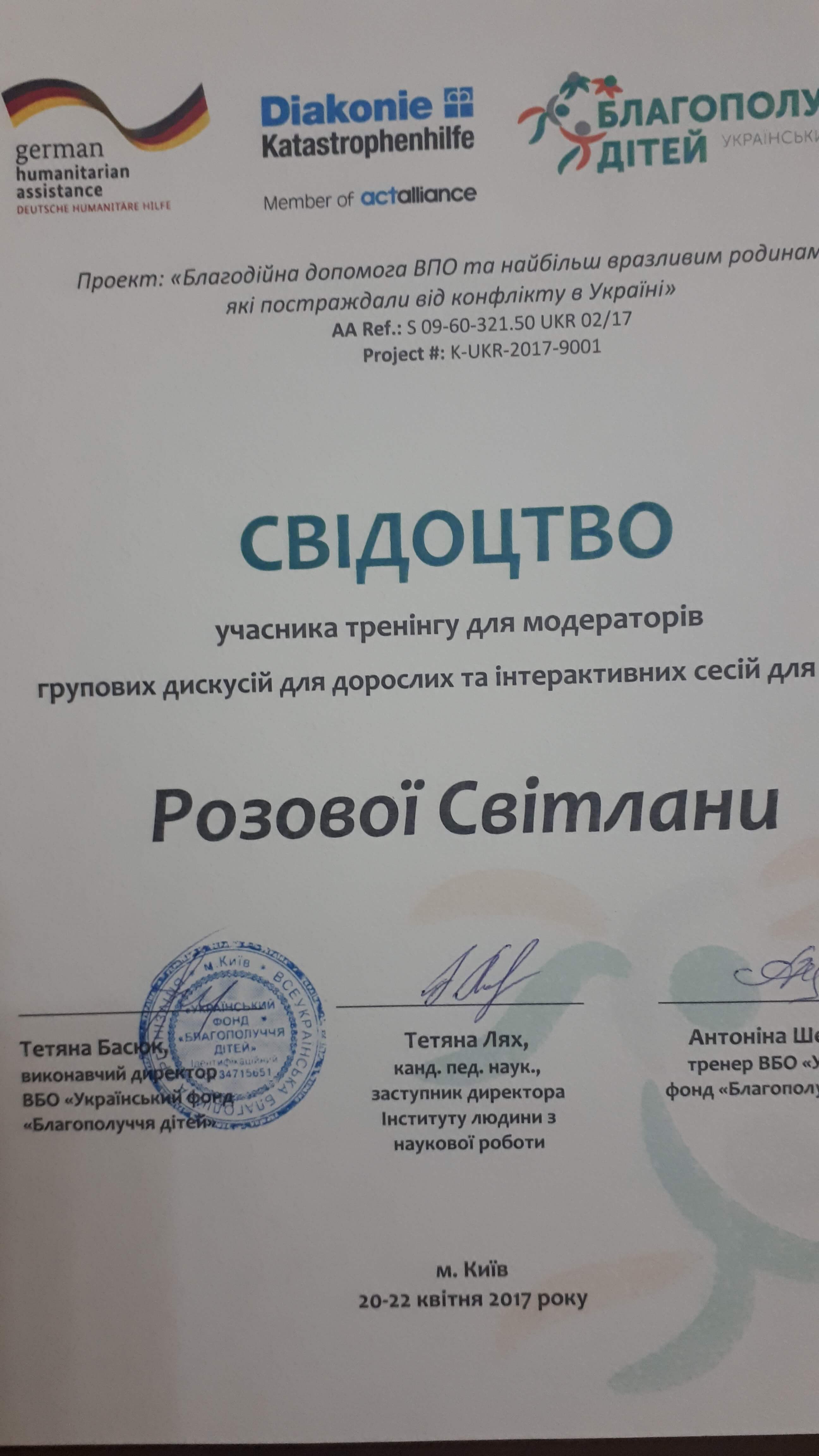 Тренінгові програми у рамках підвищення кваліфікації: подолання психотравми, терапевтична підтримка у надзвичайних обставинах, альтернативні методи вирішення конфліктів, фасилітація діалогів, ненасильницька комунікація.