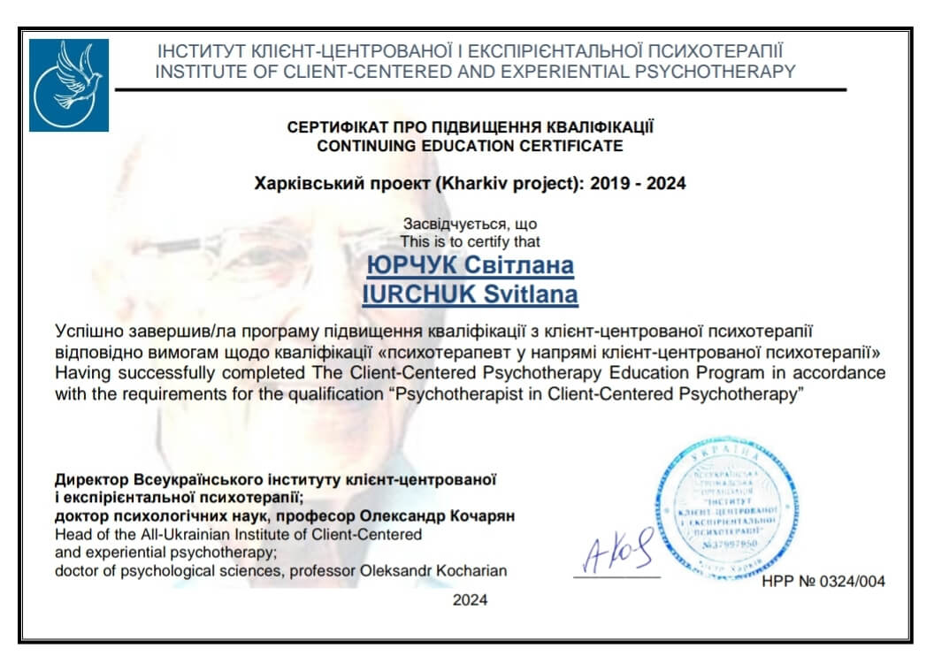 Люблю свою діяльність. І готова надати підтримку кожній людині, яка звернулася до мене за допомогою. Я постійно навчаюсь і вдосконалюю свої навички та знання. Пройшла шлях клієнта сама від і до, тому мені добре зрозумілі ті переживання, з якими людина до мене приходить. Завжди намагаюся встановити з людиною такі стосунки, в яких вона може почуватися спокійно та розслаблено та відкритись своєму досвіду.