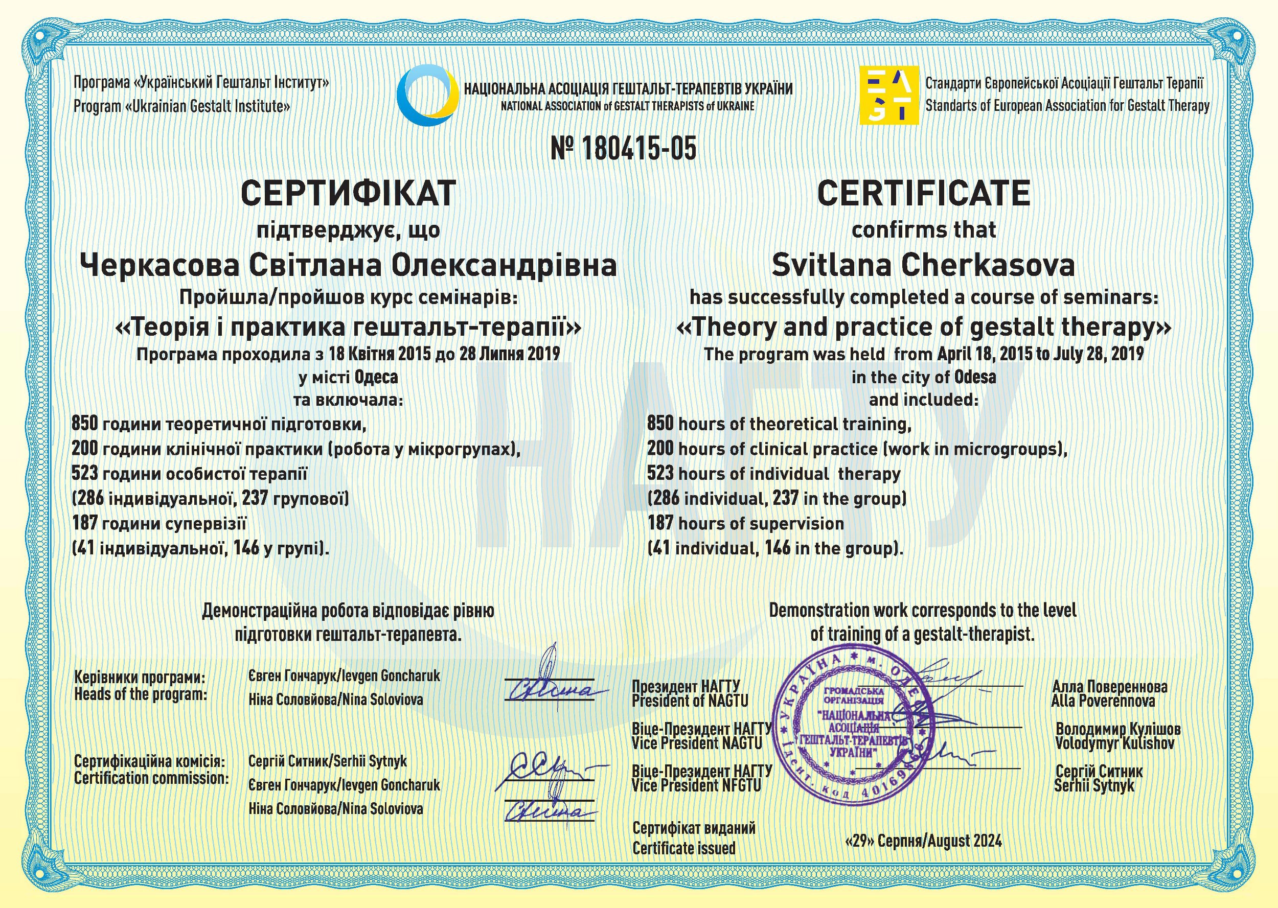 4. Національна асоціація гештальт-терапевтів України (сертифікований та акредитований гештальт-терапевт, супервізор у навчанні).