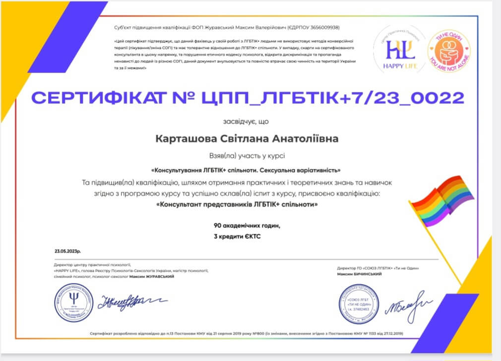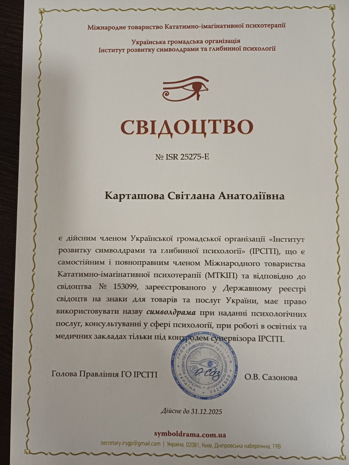 -Дійсний член громадської МВ Інституту розвитку символдрами – кататимно- імагінативної глибинної психотерапії (ІРСГП),