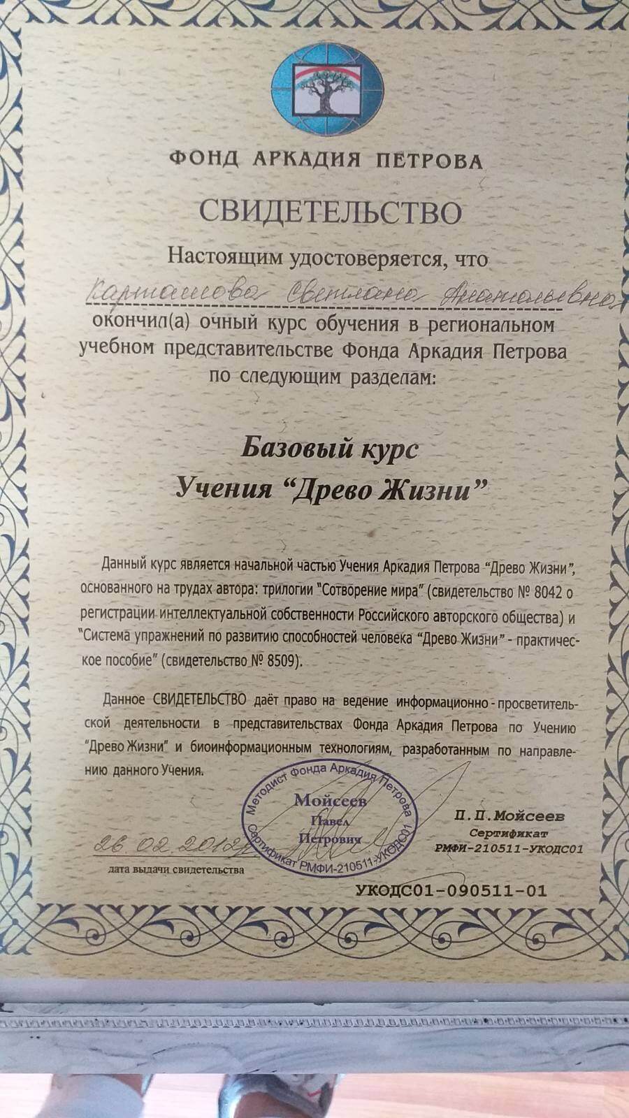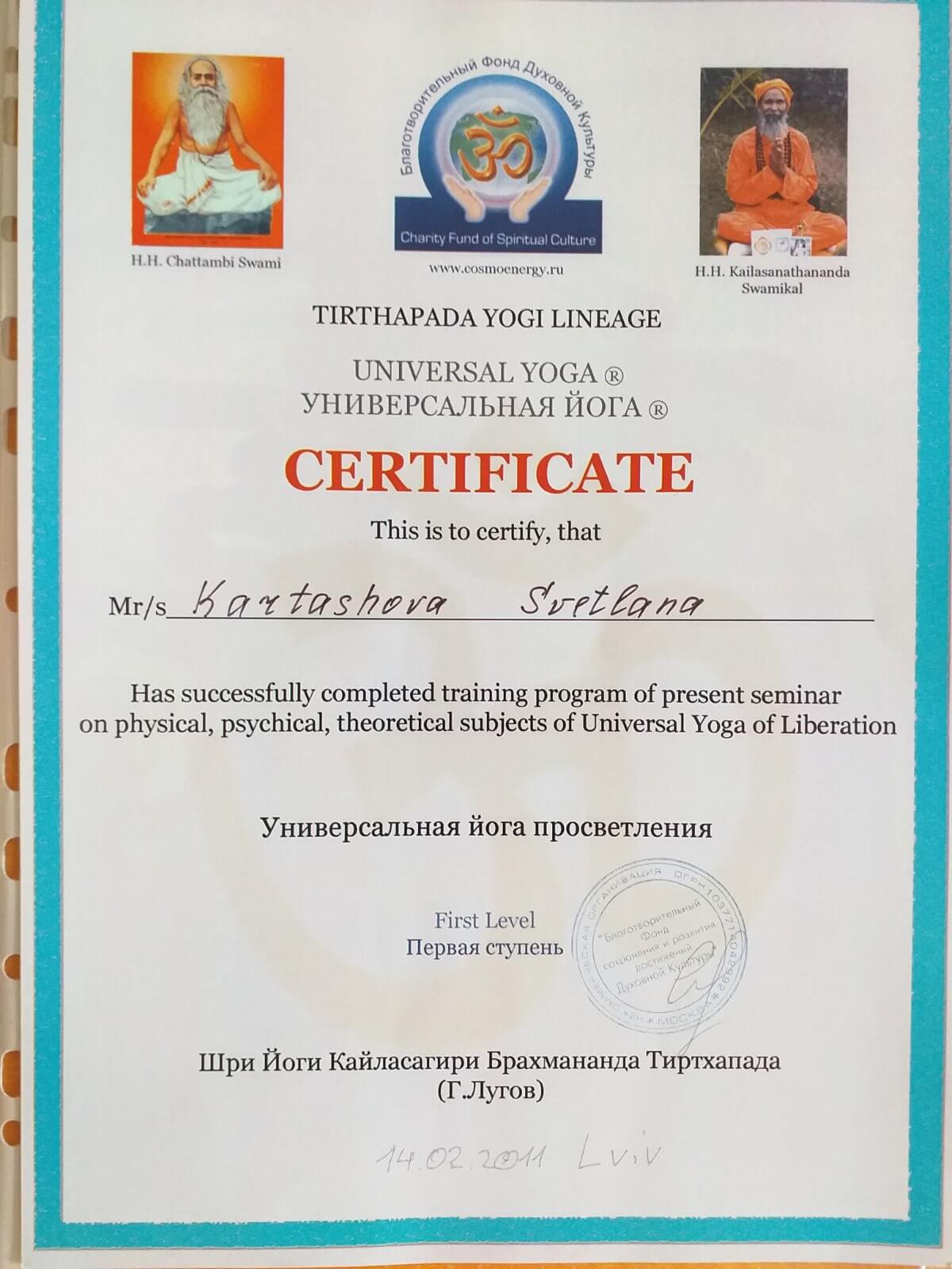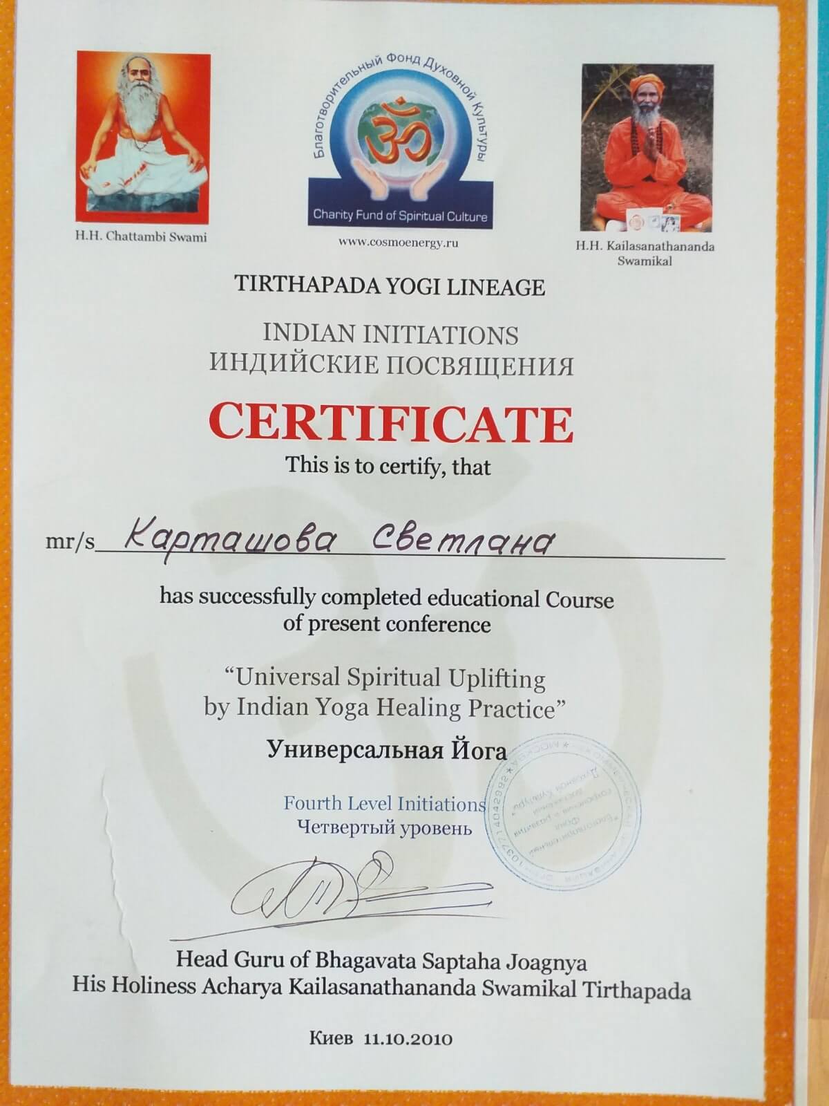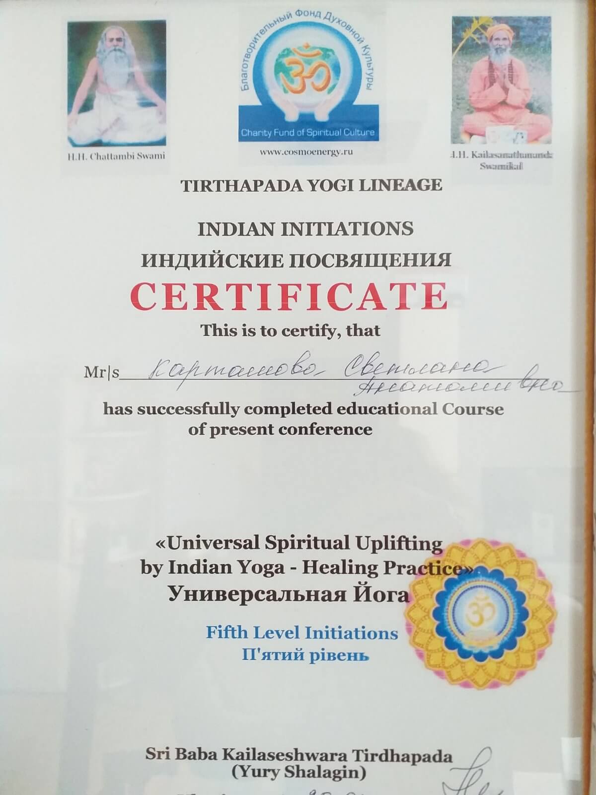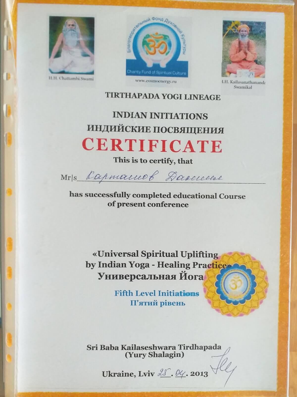 - Сертифікований інструктор з йоготерапії (посвяти від Його Святості Ачар'ї Кайласанадананда Свамікал Тиртхапада.