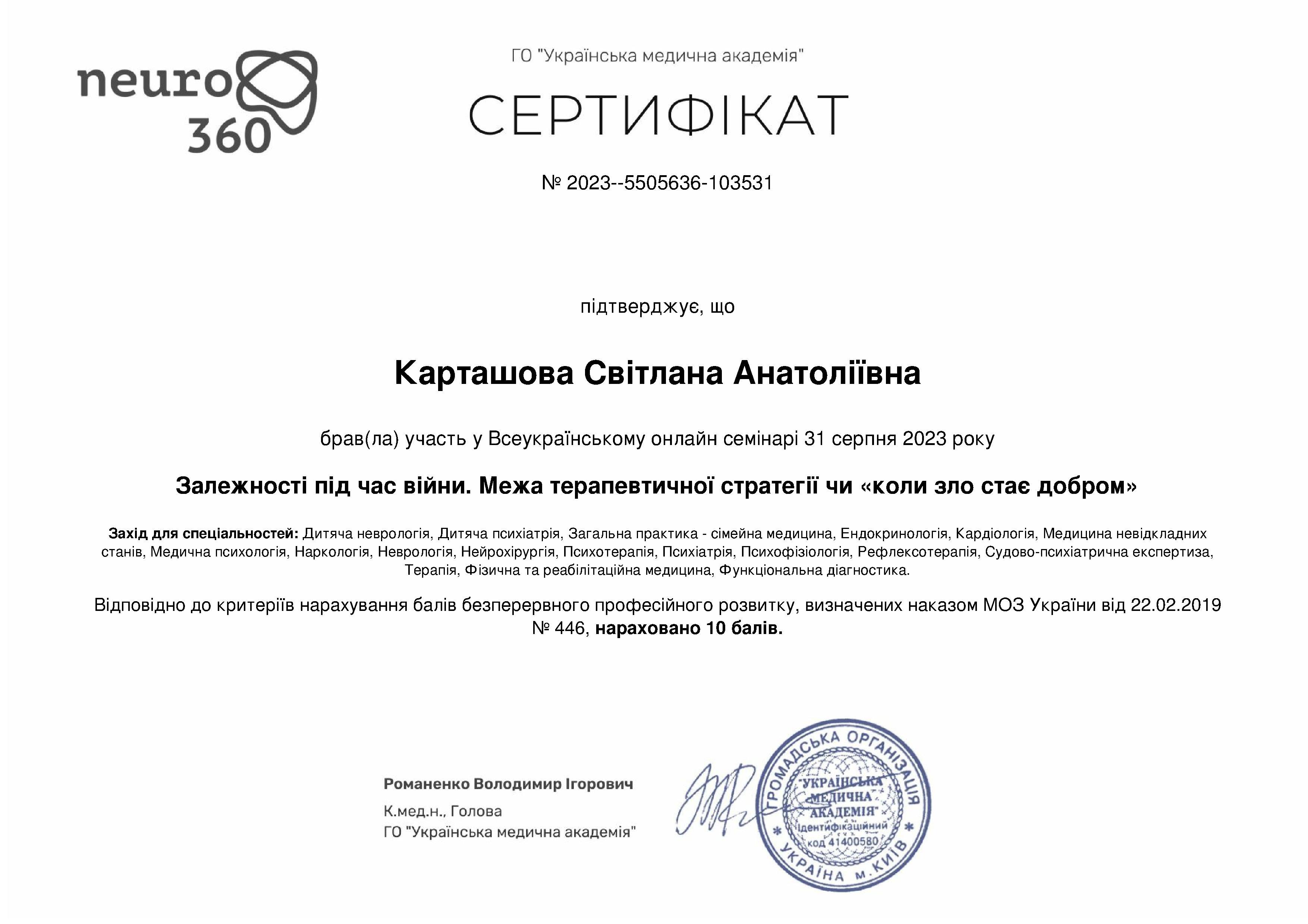 Луганський Нац.Університе ім.Т.Шевченка, Львівський Нац. Університет ім.Франка. Інститут розвитку символдрами та глибинної психології. Школа космоенергетики при науково-дослідній інституті спец.психології та космоенергетики Багірова. Школа універсальної йоги від Фонду Духовної культури. Український Психотерапевтичний університет, курс "Пропедевтика психіатричних захворювань", Кататимно-імагінативна психотерапія психосоматичний розладів.