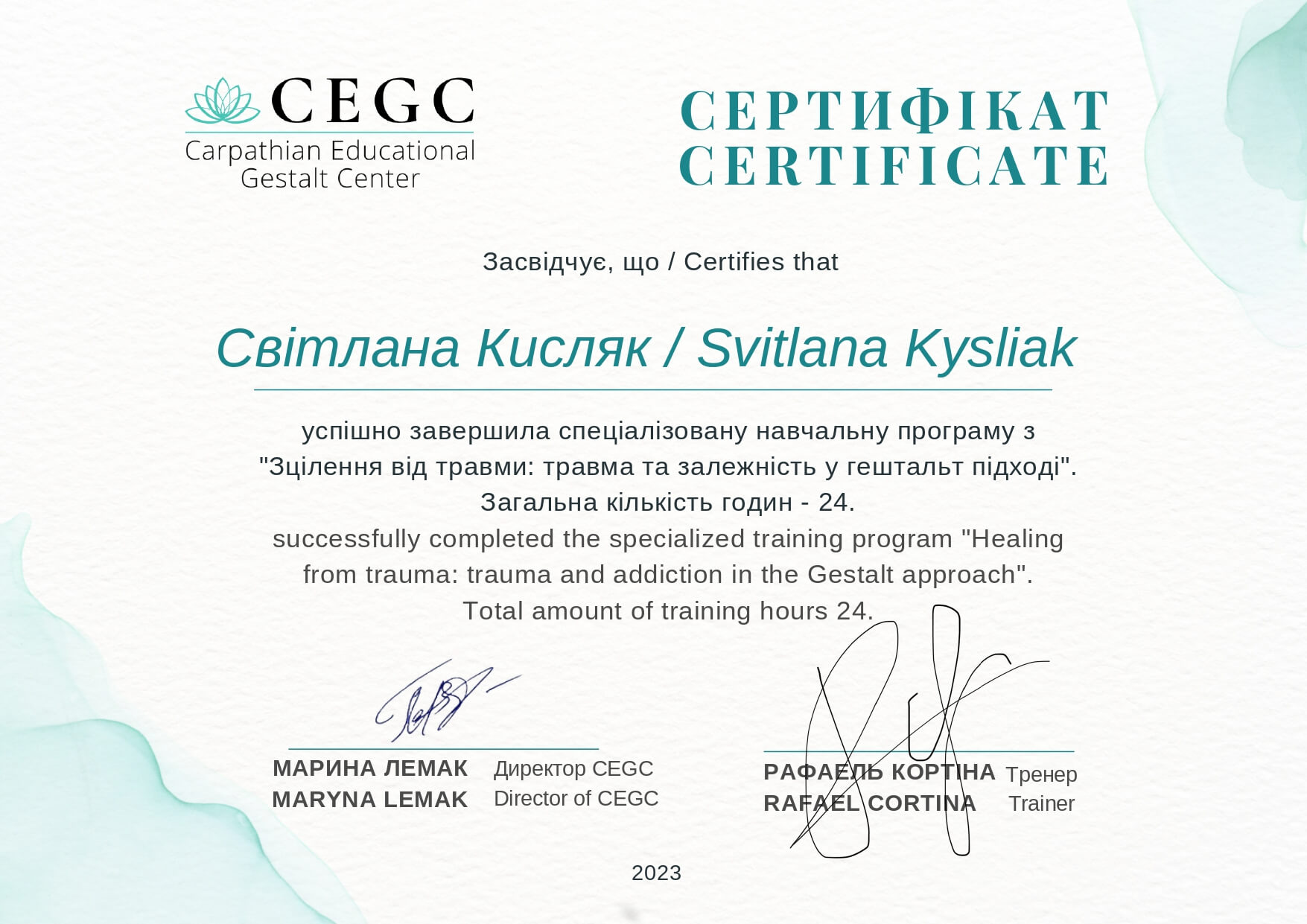 Навчальна програма "Зцілення від травми:травма та залежність у гештальт підході".(2023)
