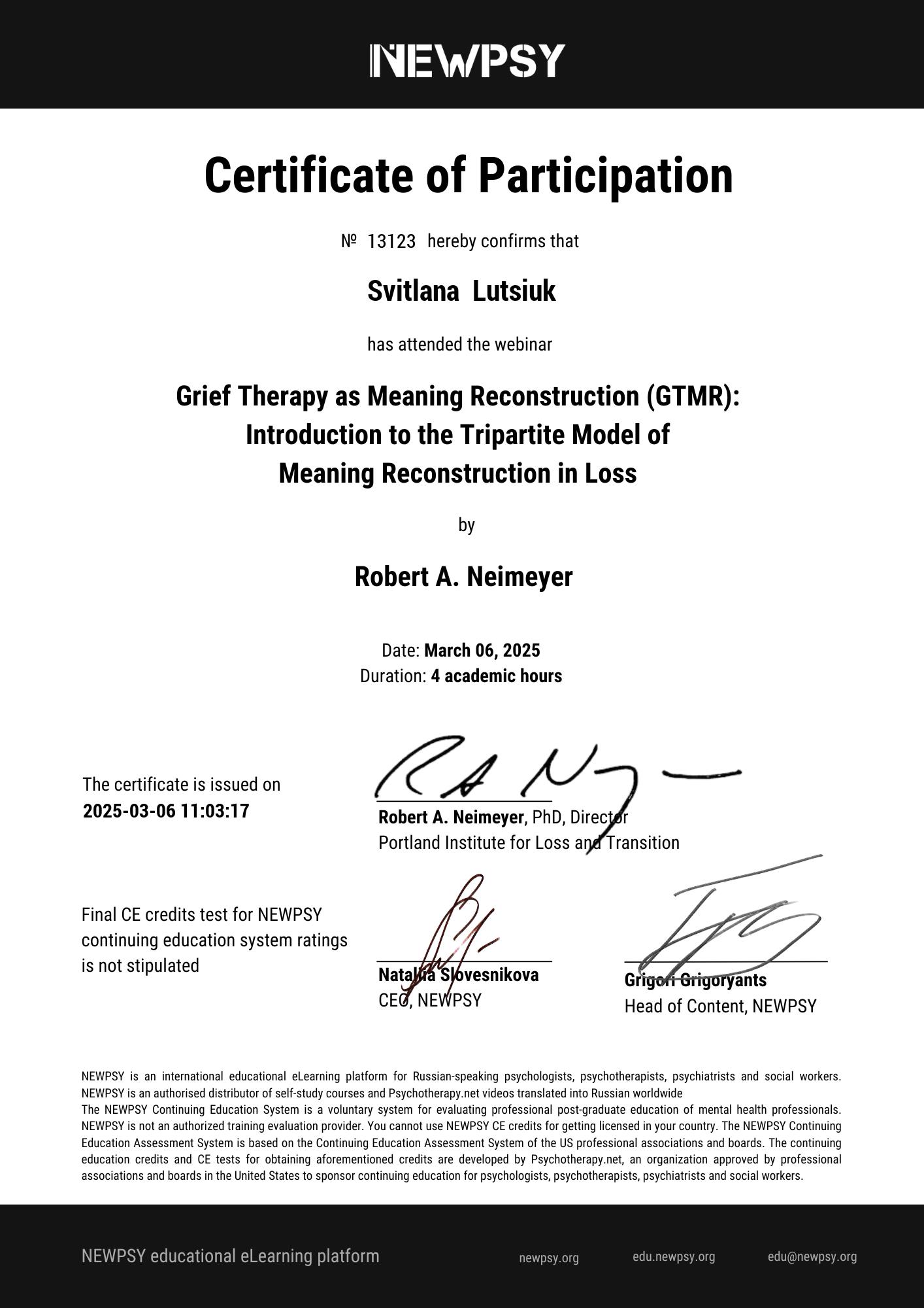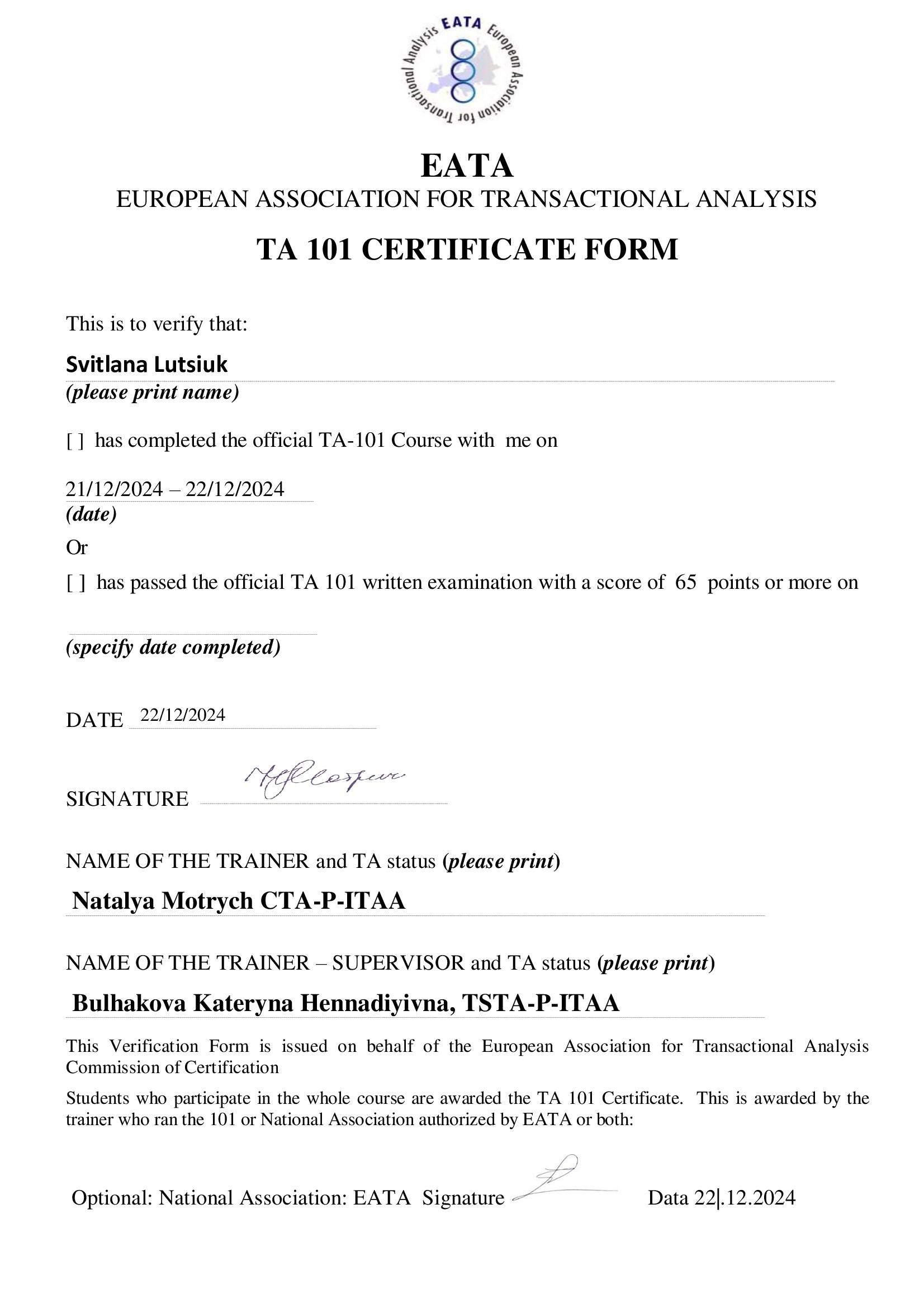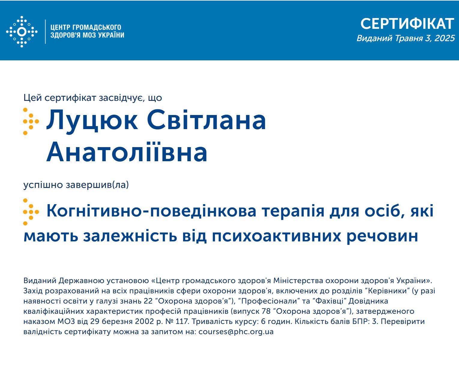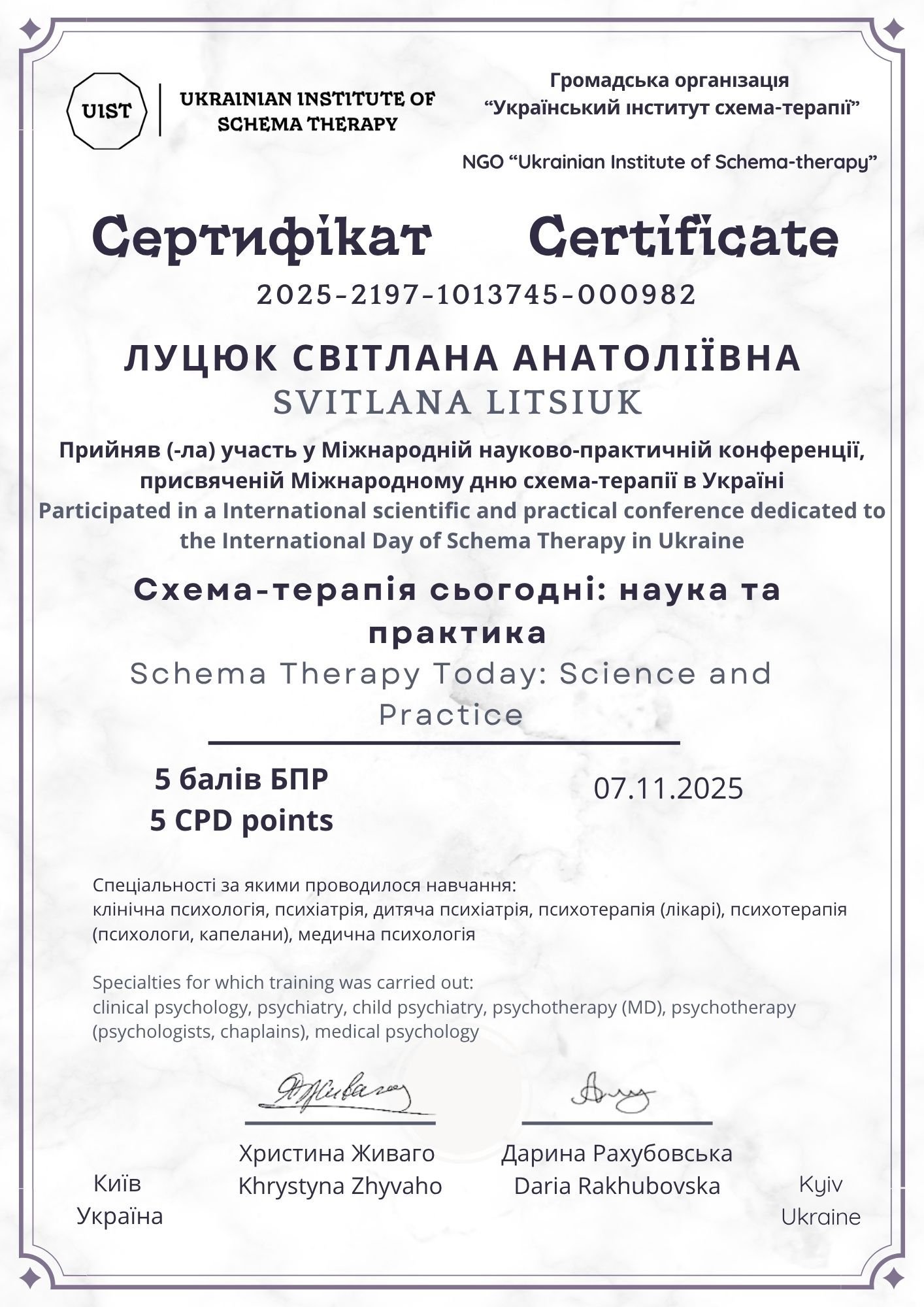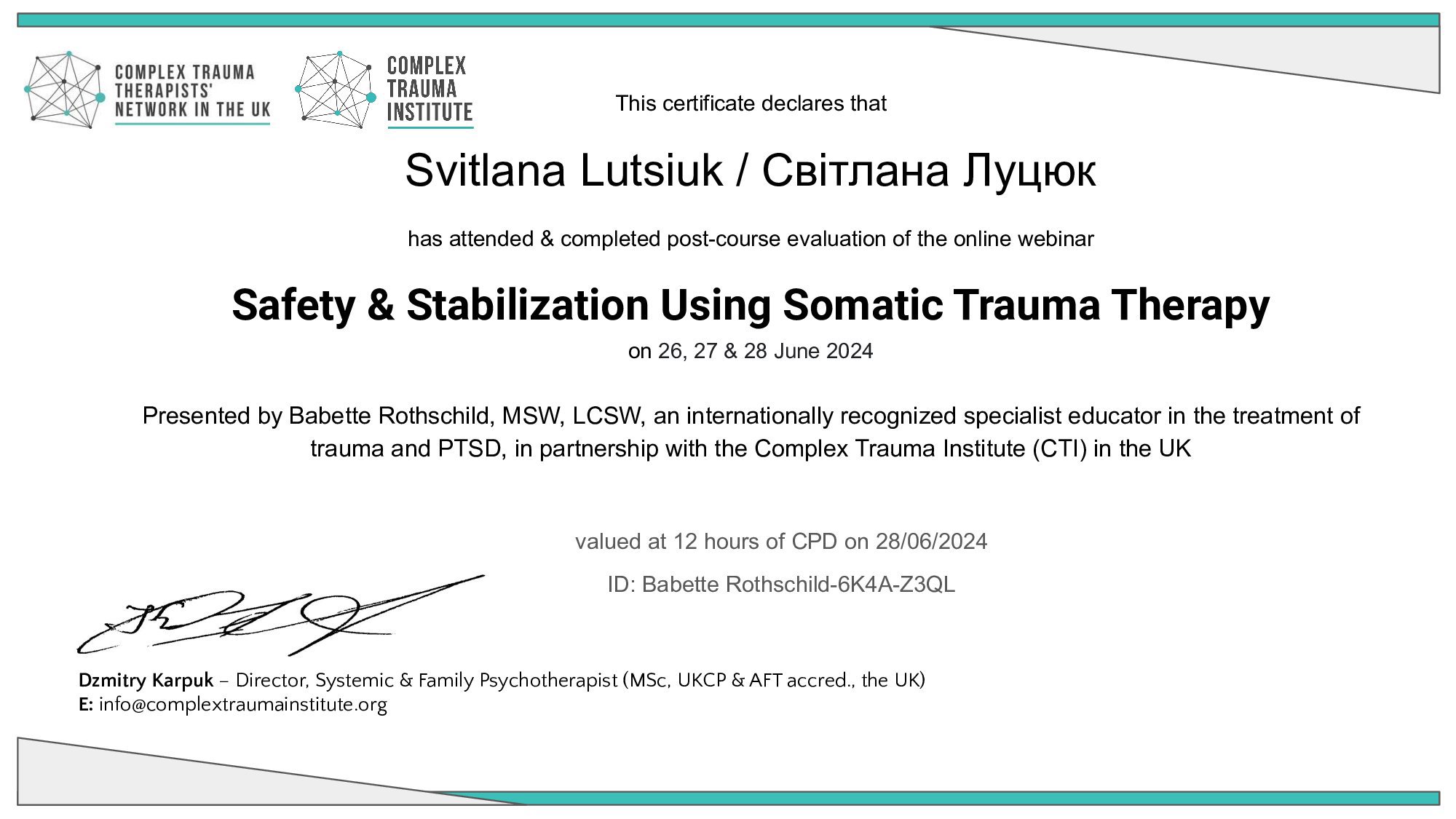 - Спеціалізована програма "Основи тілесно-орієнтованої психотерапії" — у процесі навчання.