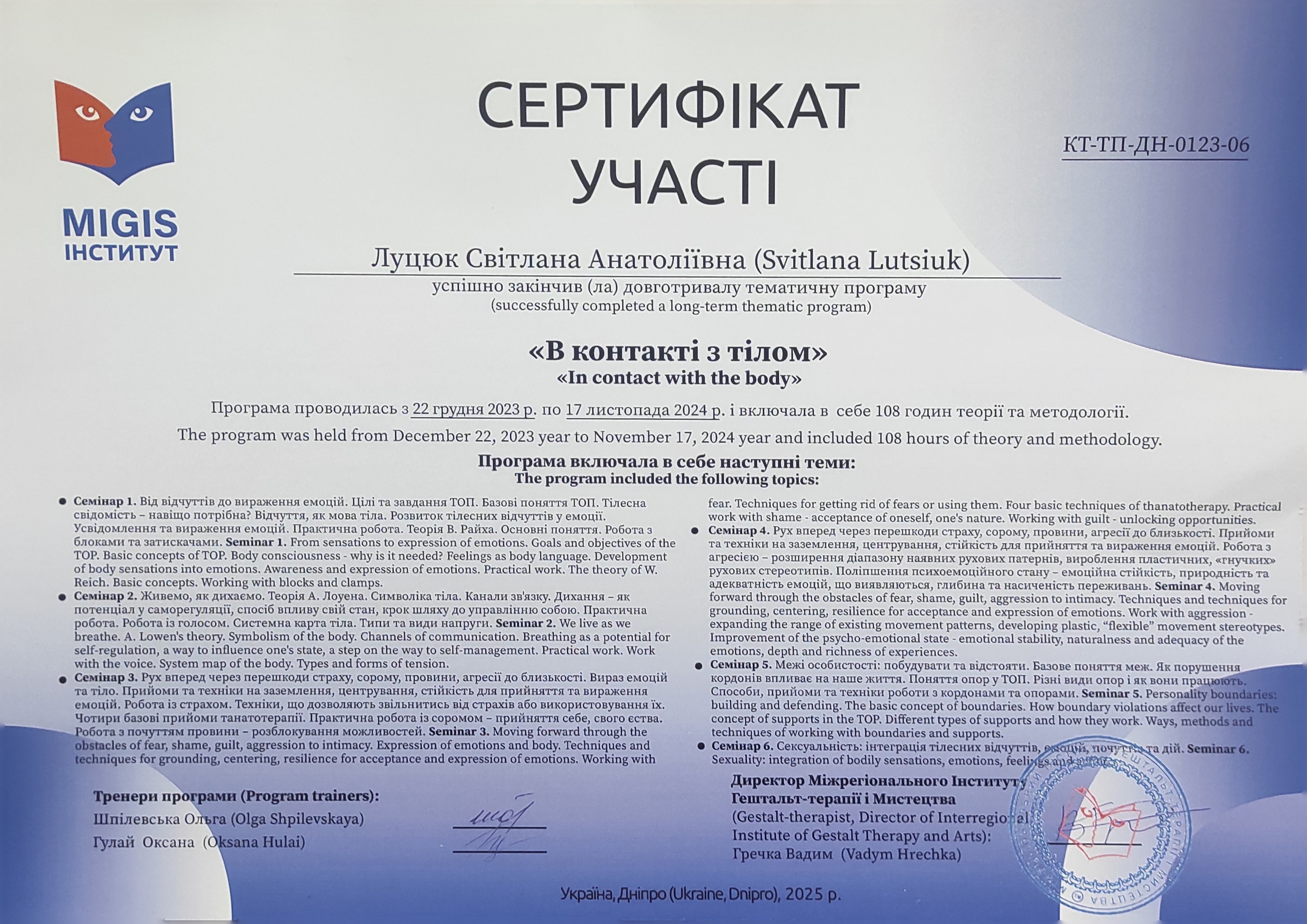 - Тематична програма з тілесно-орієнтованої терапії - 108 годин.