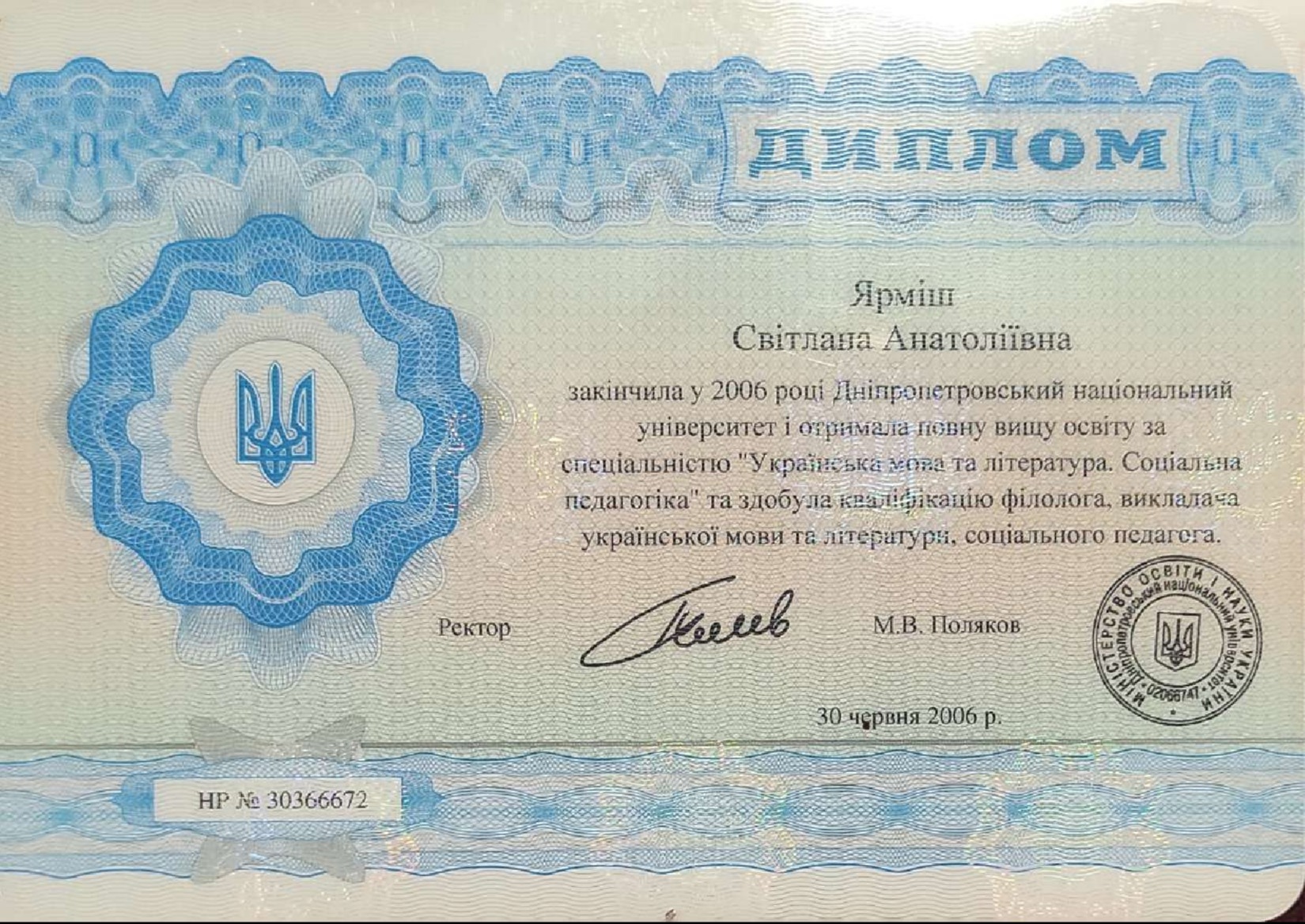 Перша освіта — українська філологія та соціальна педагогіка, спеціаліст (ДНУ ім. О. Гончара).