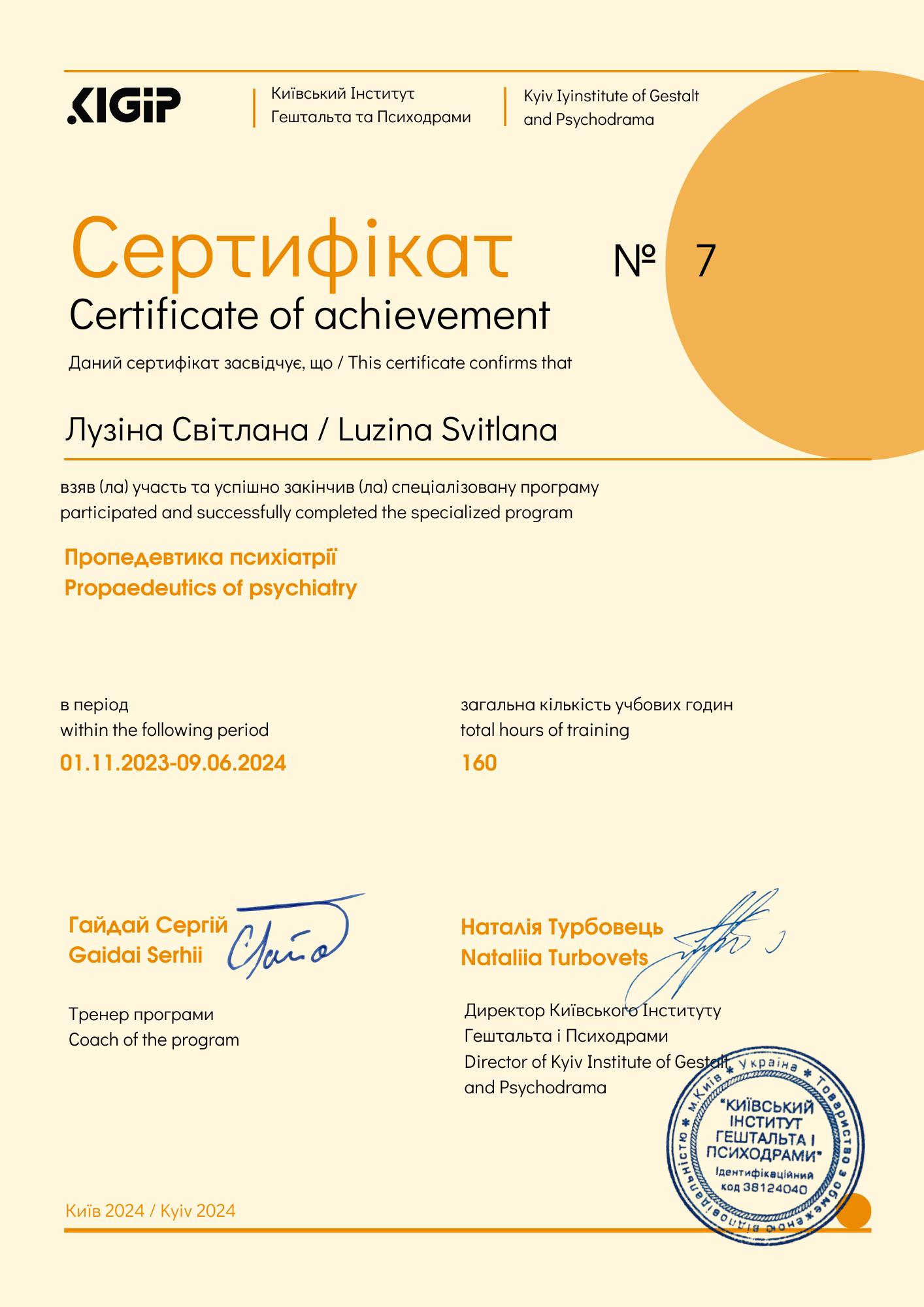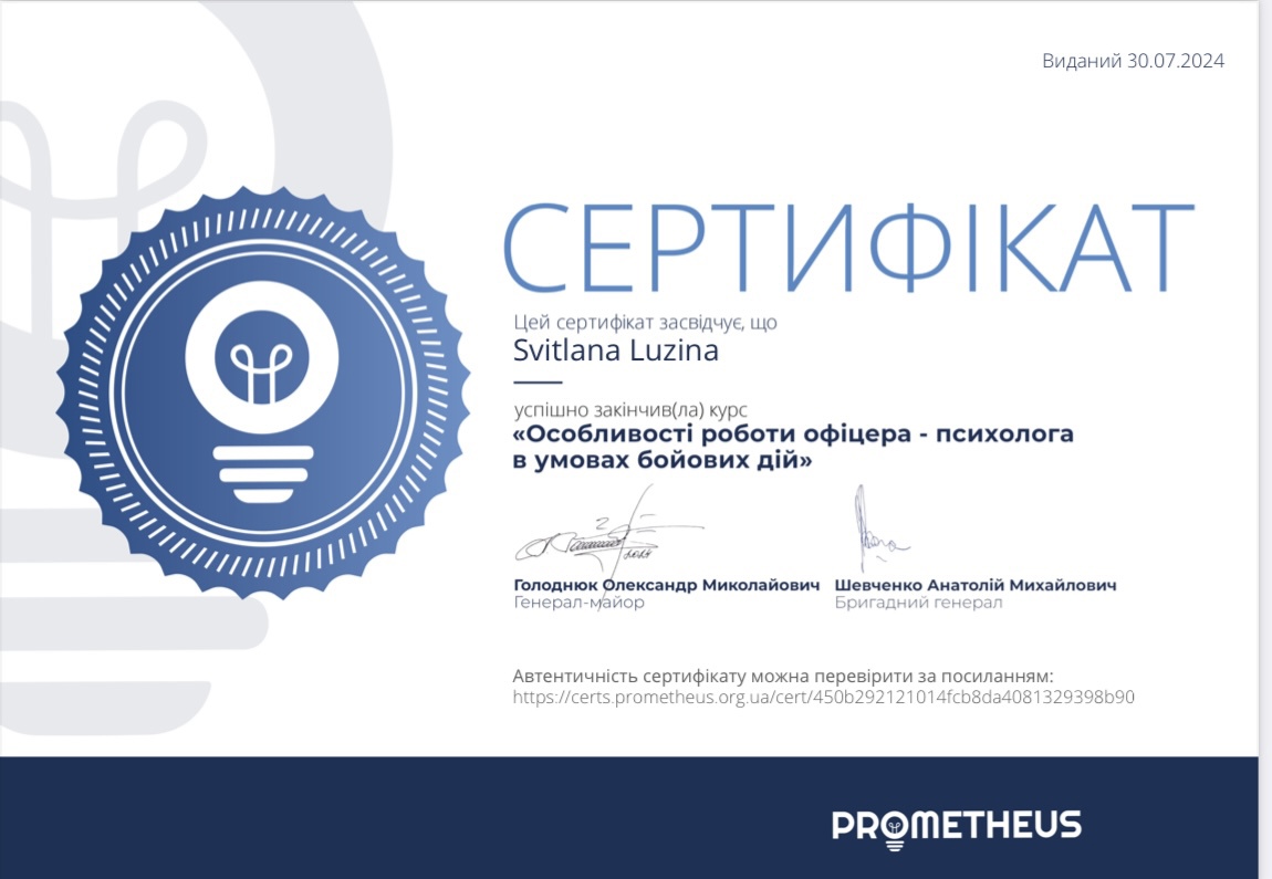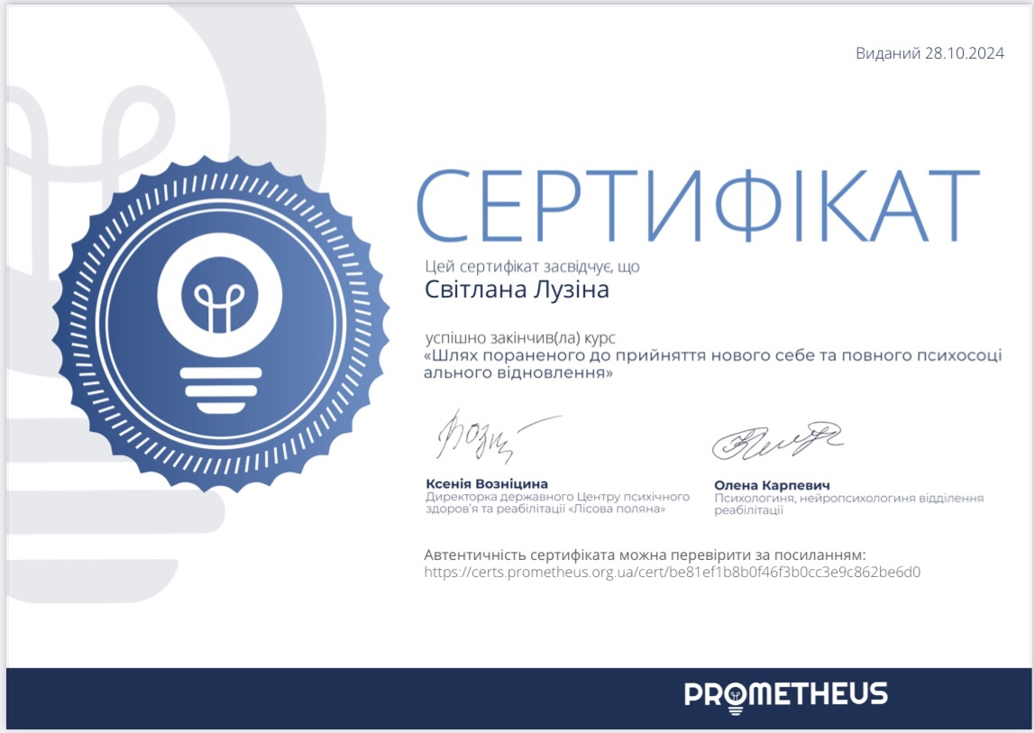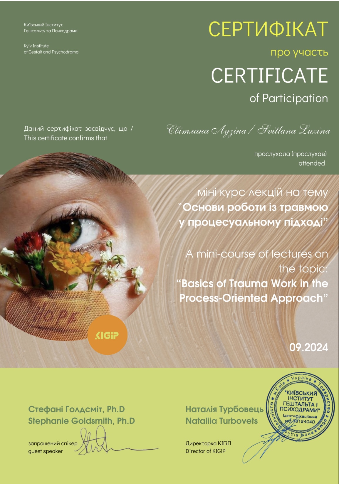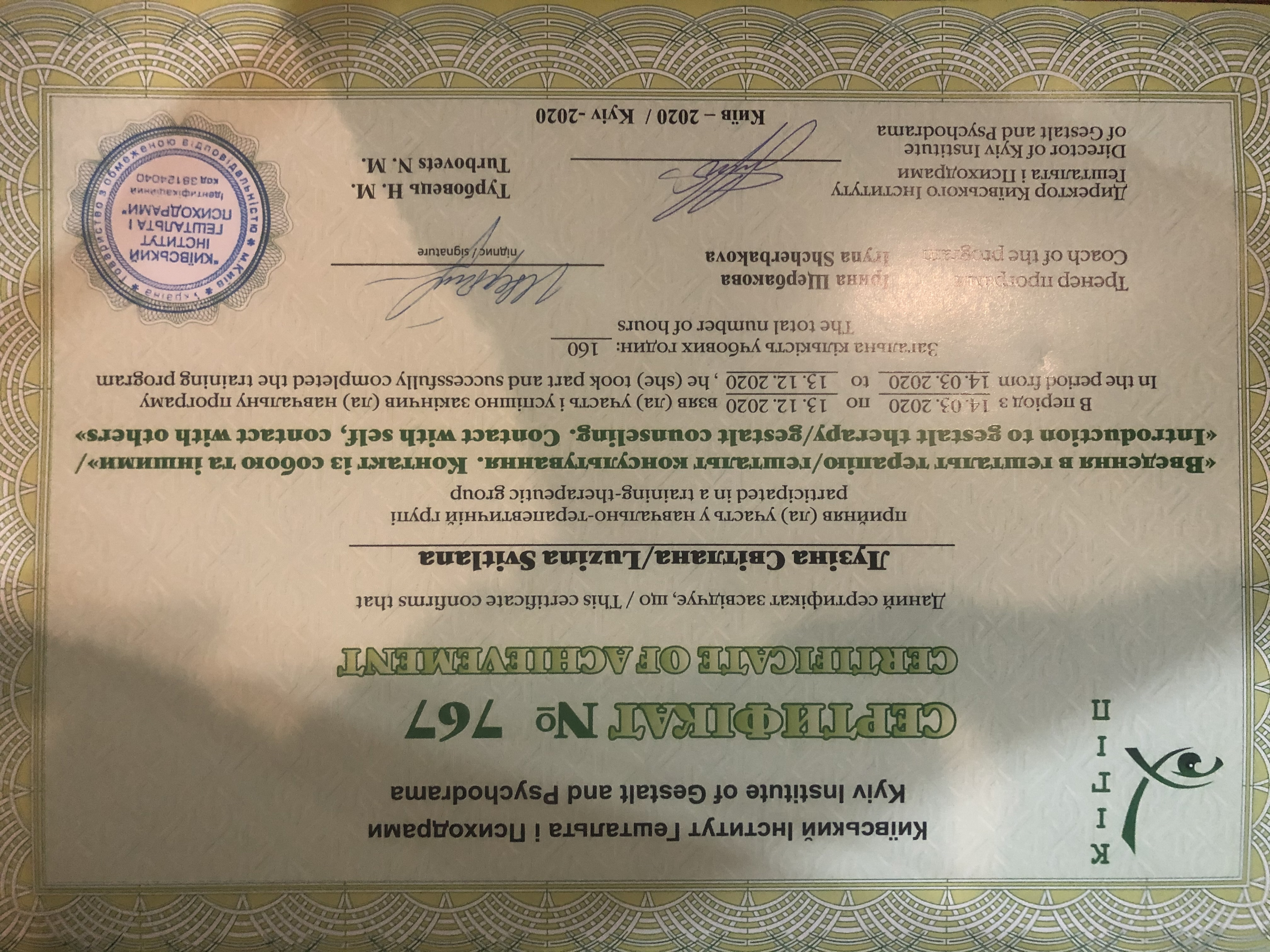 Я практичний психолог та гештальт-терапевт, однак в роботі використовую інтегрований підхід. Працюю у напрямках індивідуального консультування та терапії дорослих, а також дитячої/підліткової/сімейної терапії. Психологія завжди була зоною мого інтересу. Після подолання власної кризи, вирішила розвиватись вже професійно у цій сфері. Почала практикувати з початком війни, маю регулярну власну терапію та супервізію, постійно навчаюсь. Запрошую у подорож, але не світом, а до куточків вашої душі. Глибиною подорожі керуєте Ви, а я обіцяю бути поруч і підтримувати. Я не «вчу жити», у мене не має «чарівної пігулки», але є знання та інструменти, які допоможуть Вам знайти шлях для кращого розуміння себе та своїх потреб, реакцій, поведінки. І як результат побачити способи подолання труднощів у різних сферах свого життя. Бережно та обережно у безпечному просторі, де немає місце знецінення та засудження, де ви точно «такий/така». Вважаю, що спеціаліст має бути гарним «археологом», «провідником», «дослідником», надійною точкою опори, а головне бути поруч у цій мандрівці з людиною. Поруч з клієнтом-це бути уважним до його проявів, бути щирим, бути присутнім і включеним.