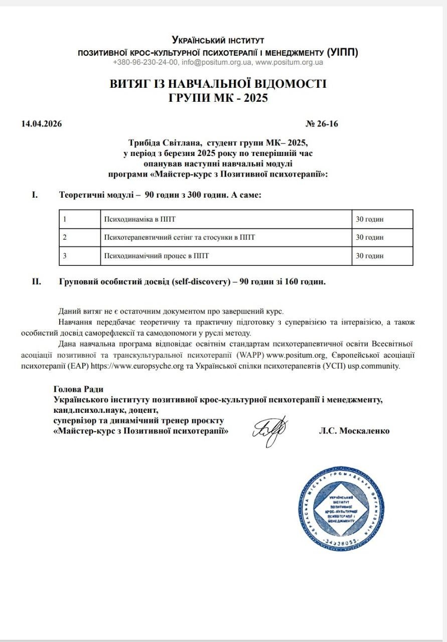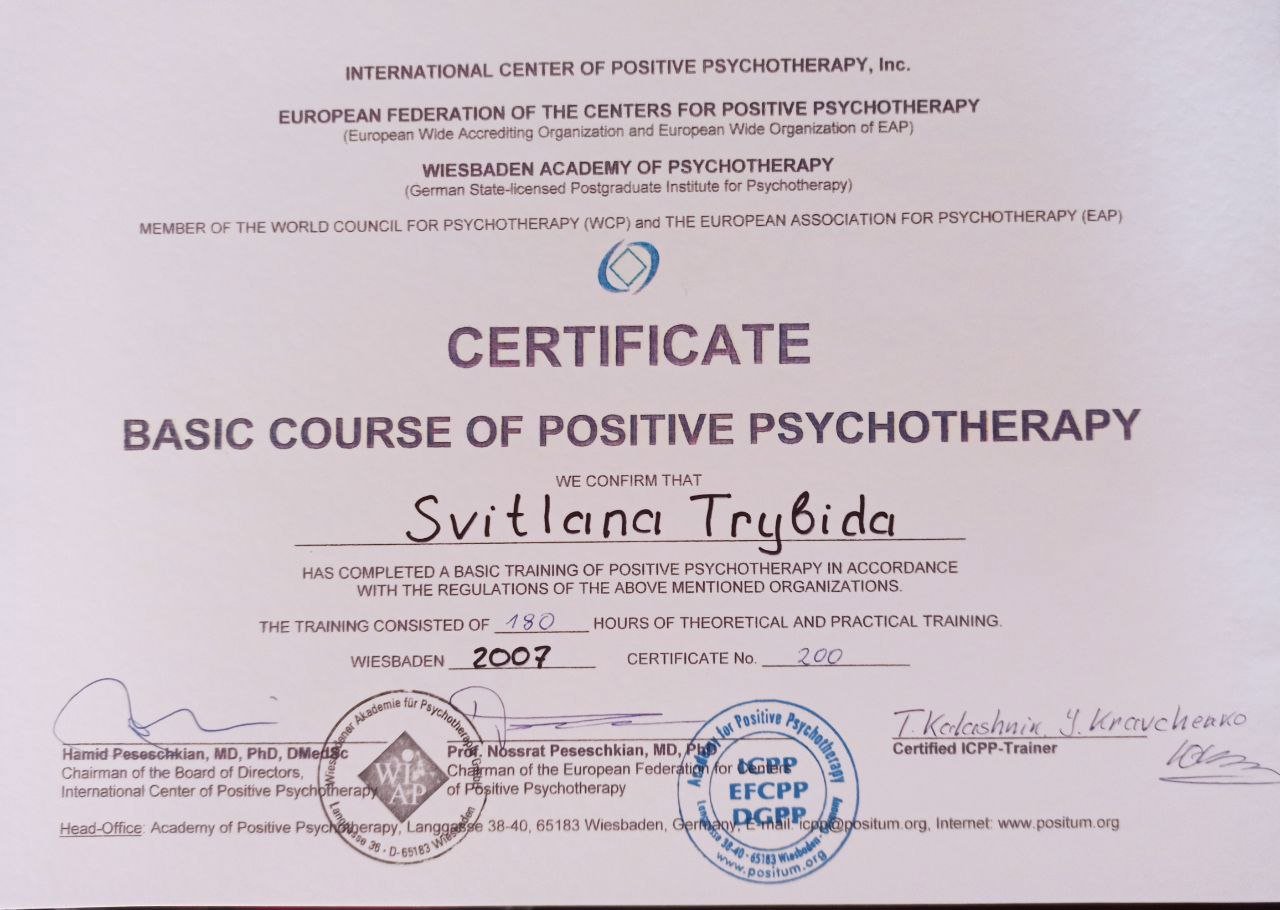 Я дипломований психолог, консультант у методі позитивної психотерапії, психотерапевт у навчанні в методі позитивної психотерапії. Маю великий досвід роботи як HR менеджер, супроводжую і спрямовую людей у їхньому гармонійному з особистим професійному розвитку.