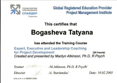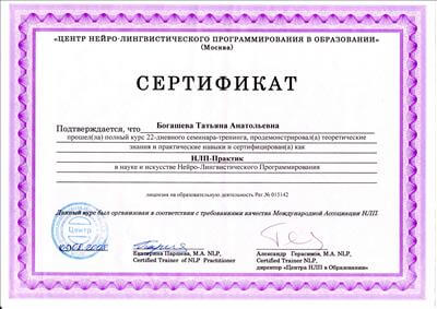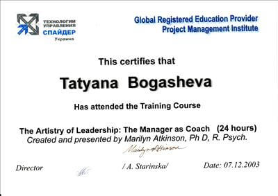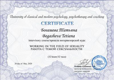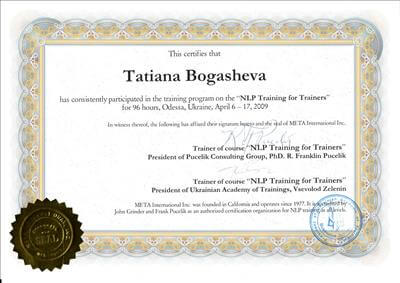 Практичний психолог, ІІСТ (Інститут системної інтегративної психотерапії (Москва), НЛП - майстер, практик, Сертифікований коуч (Канада-Київ), Метод Хосе Сільви, Метод Шварцу, Енергокоучинг (GoE, Англійська Гільдія Енергопрактиків, Energist Business School Катерини програми листопад 2020р.), Ведуча Ігри "Три Кристали Сили" у сімейному форматі, Сексологія (Курси Тетяни Славіної).