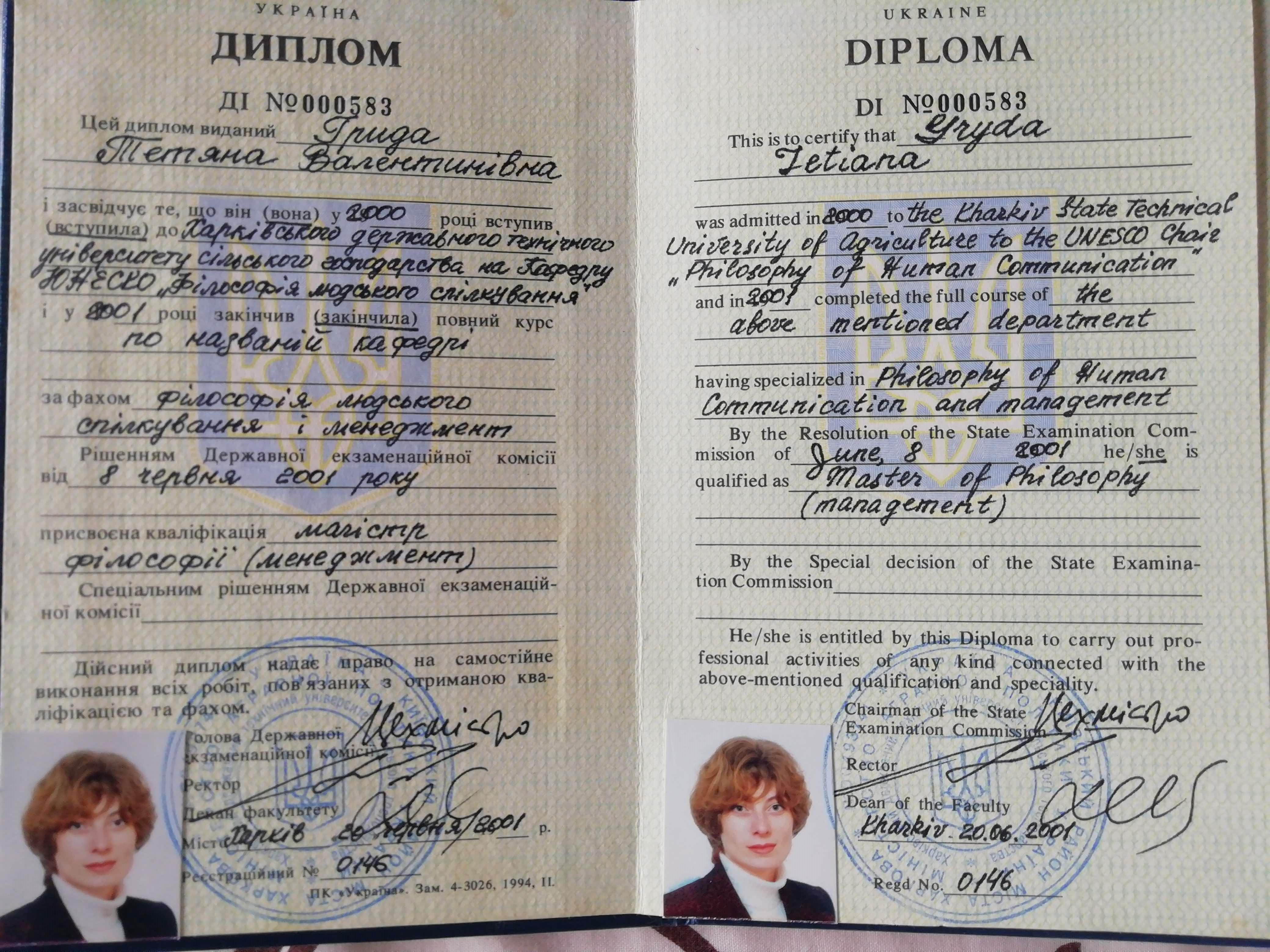 Харківський державний університет ім. Горького біологічний факультет, Харківський державний педагогічний університет ім. Г. Сковороди, психолог. Гештальт терапевт, МІГІП, МІГ. Травматерапевт Інститут Бодинаміки Данія.