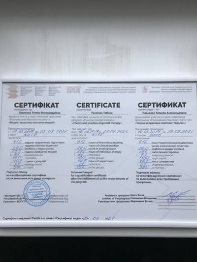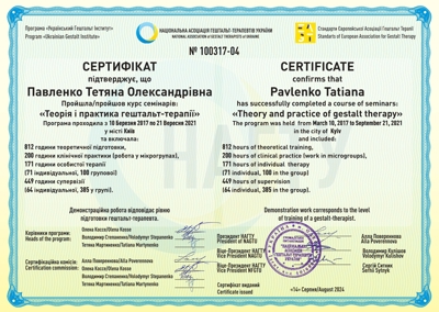 Український гештальт-інститут, ВОППГП, сертифікований гештальт-терапевт.